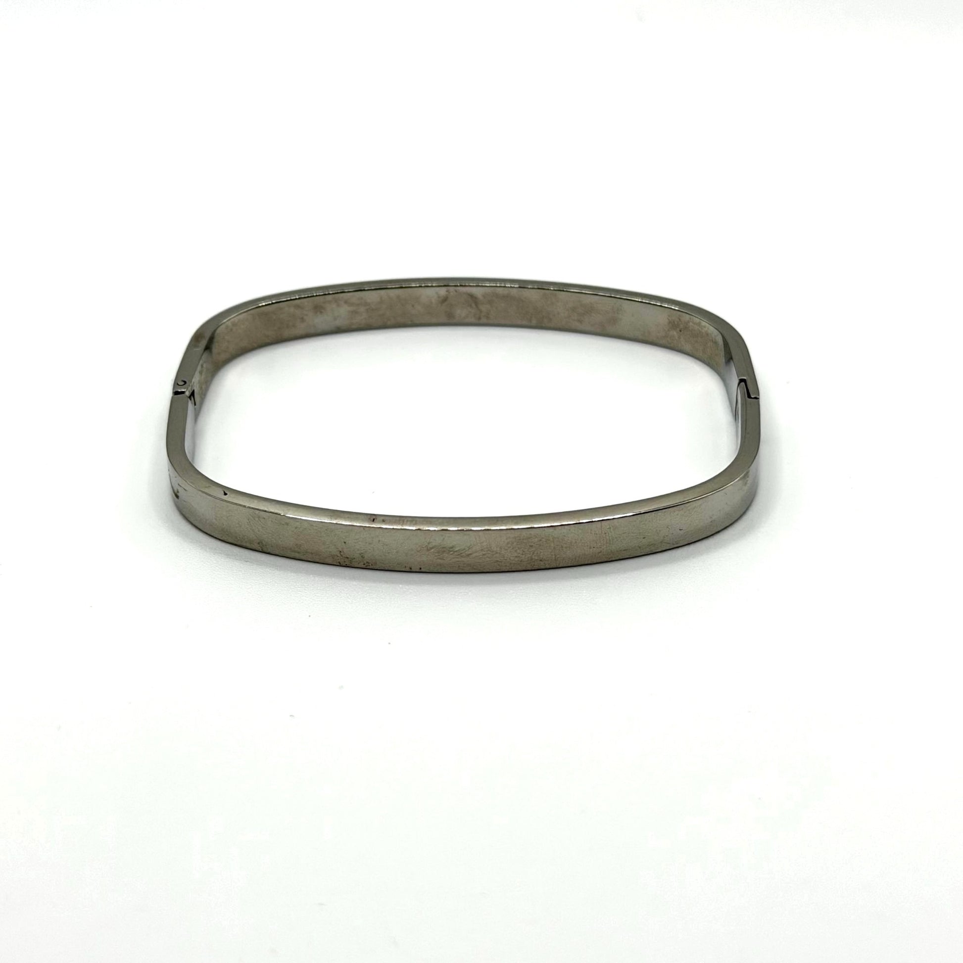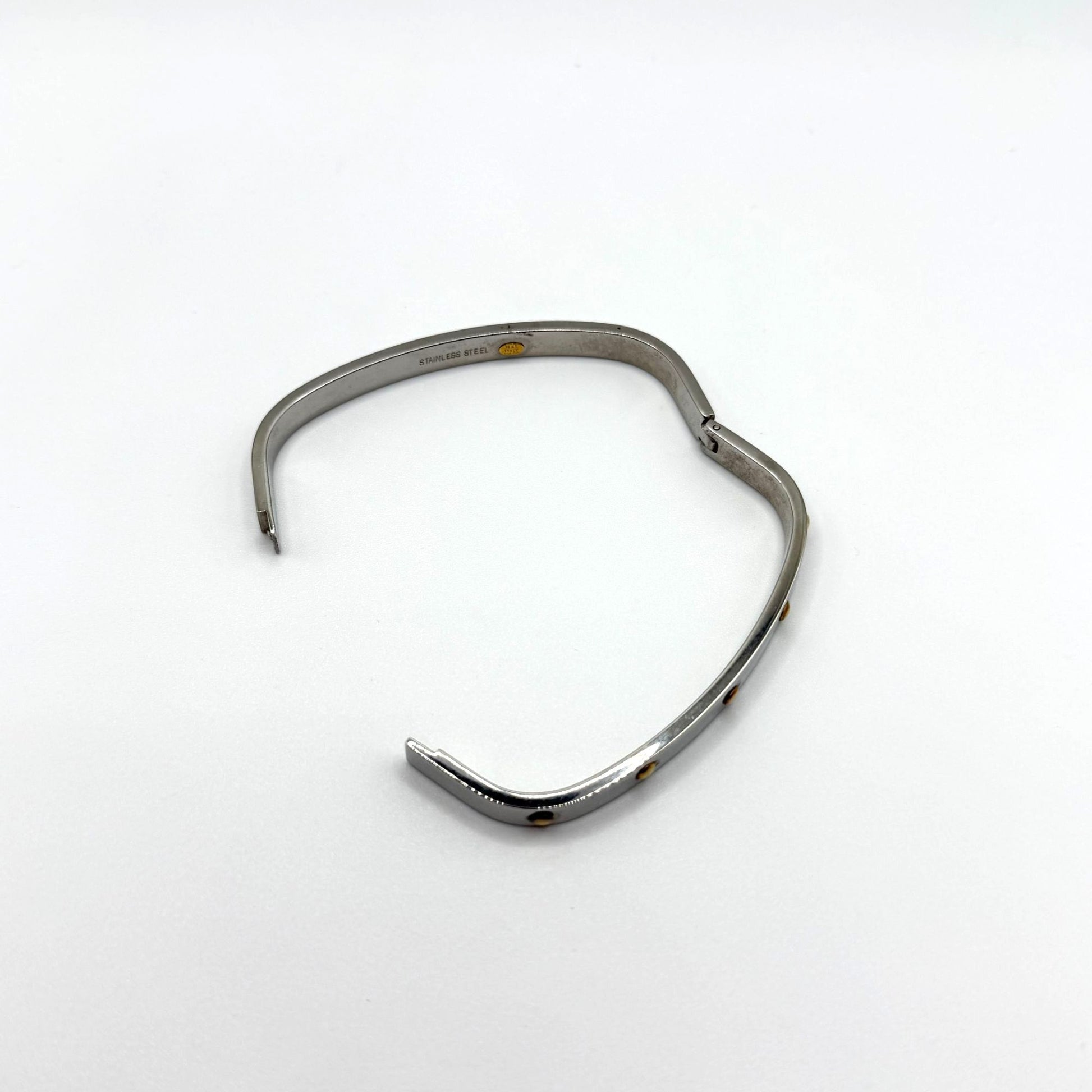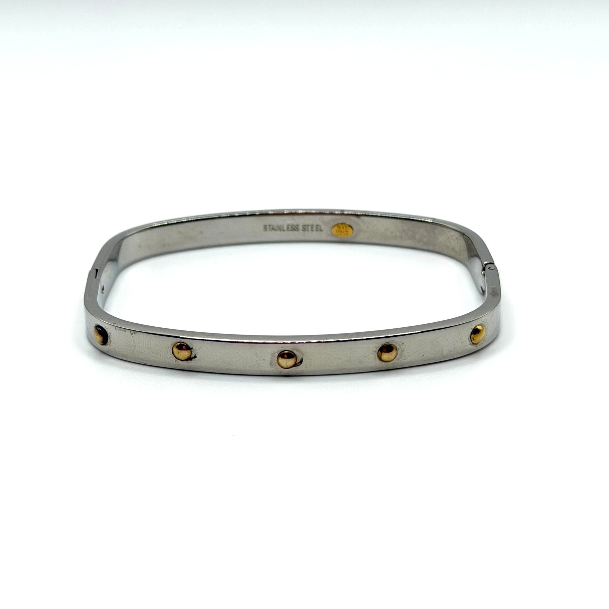 This stainless steel bangle with 18K yellow gold accents combines durability with timeless elegance. The square shape and hinge closure ensure a secure, comfortable fit.
