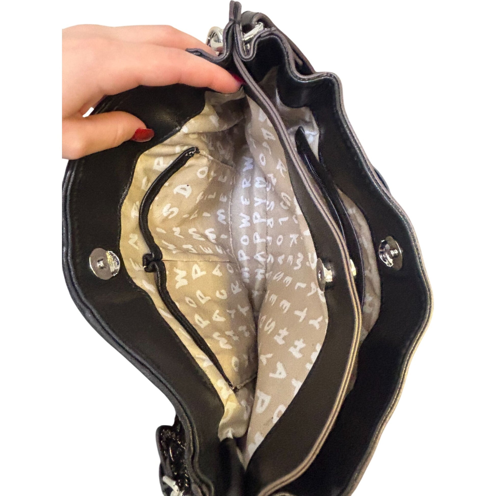 • Quilted leather design • Studded accents • Adjustable shoulder strap • Double entry compartments • Back zipper pocket