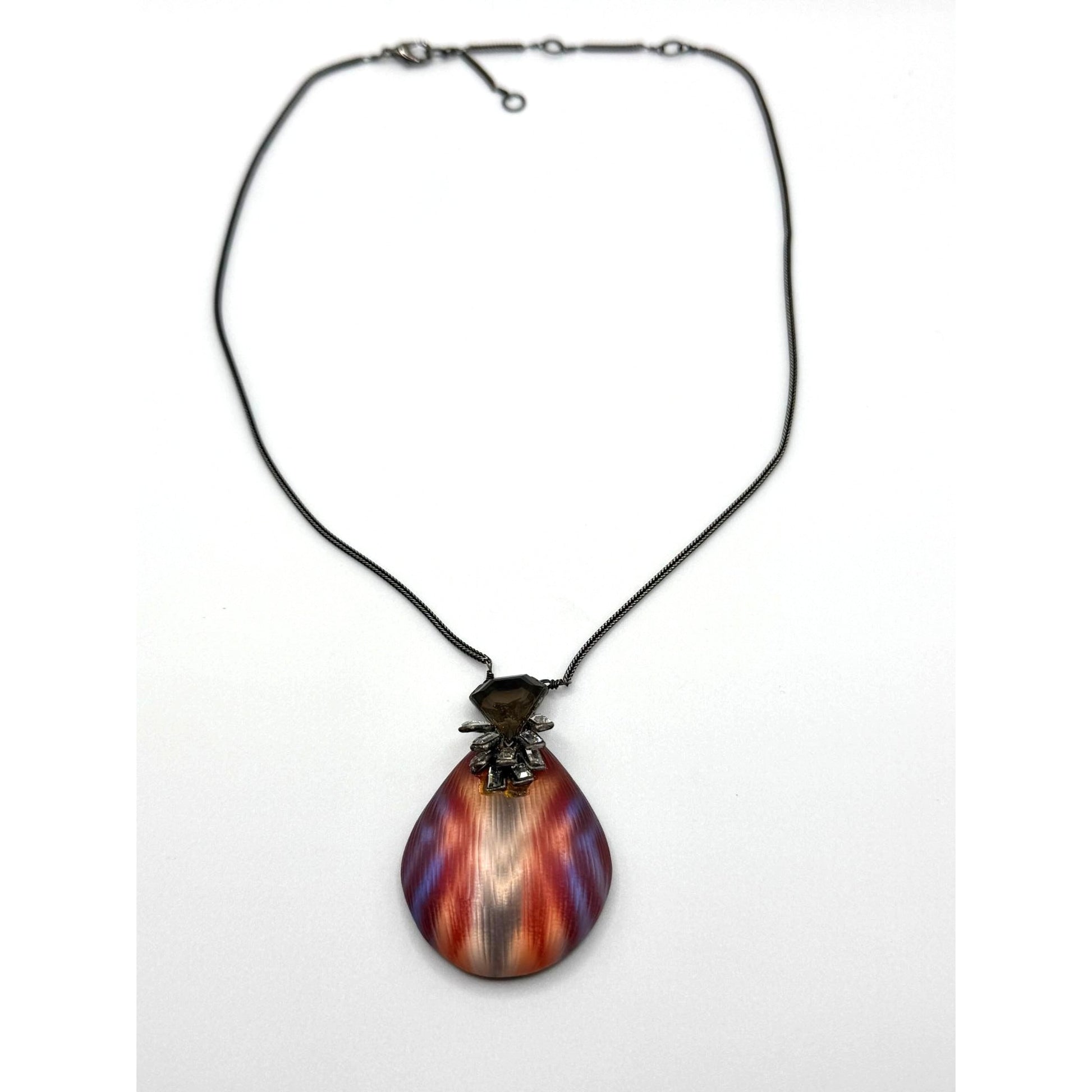 A sophisticated Alexis Bittar necklace featuring a hand-carved gradient resin pendant paired with crystal embellishments, ideal for elegant or professional wear.