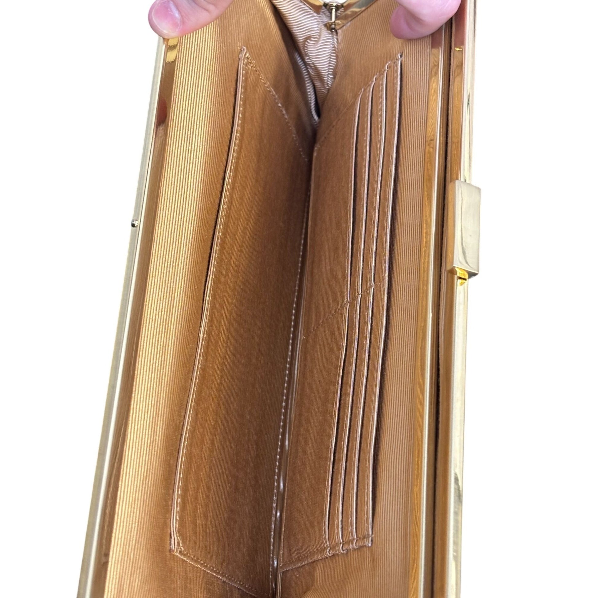 This Hobo clutch wallet showcases a striking animal print design, paired with a sophisticated gold frame. The wallet includes multiple compartments for organized storage, making it both fashionable and functional. Its sleek design is ideal for those who appreciate style while maintaining practicality.