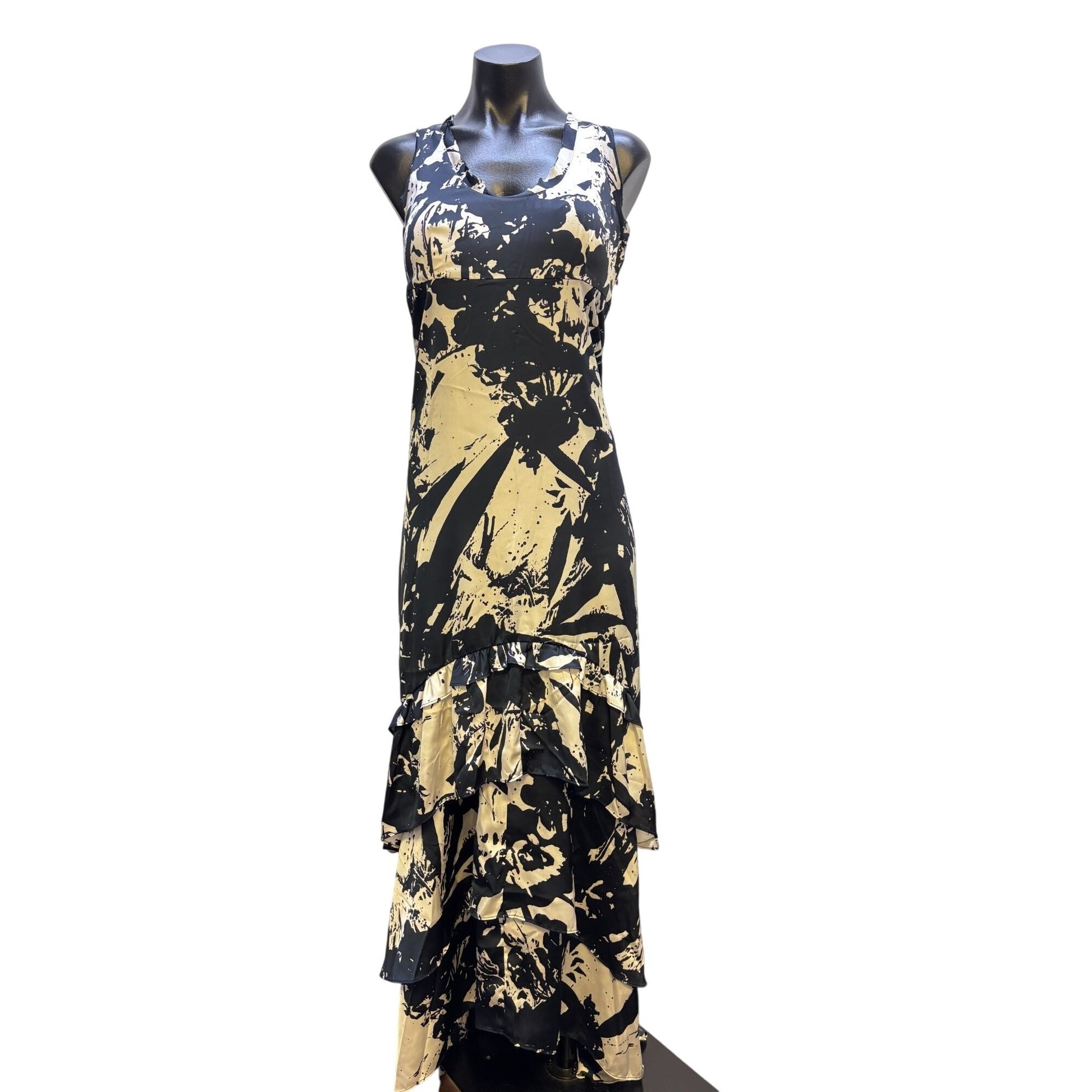 This Banana Republic dress is designed for a sophisticated and stylish look. Its sleeveless design and ruffle hem create an elegant silhouette, while the abstract print adds a modern touch. Ideal for various professional settings, this maxi dress is both comfortable and fashionable, making it a versatile wardrobe addition.
