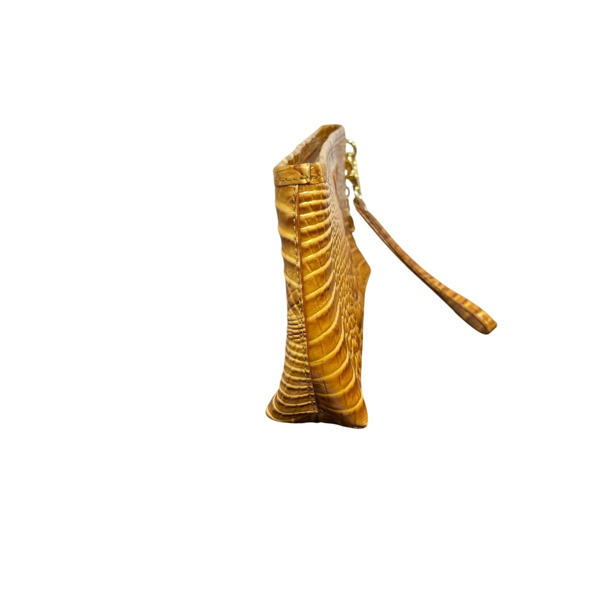 This Brahmin wristlet combines elegance and practicality with croc-embossed leather, a secure zip closure, and a detachable wrist strap. Ideal for carrying essentials.