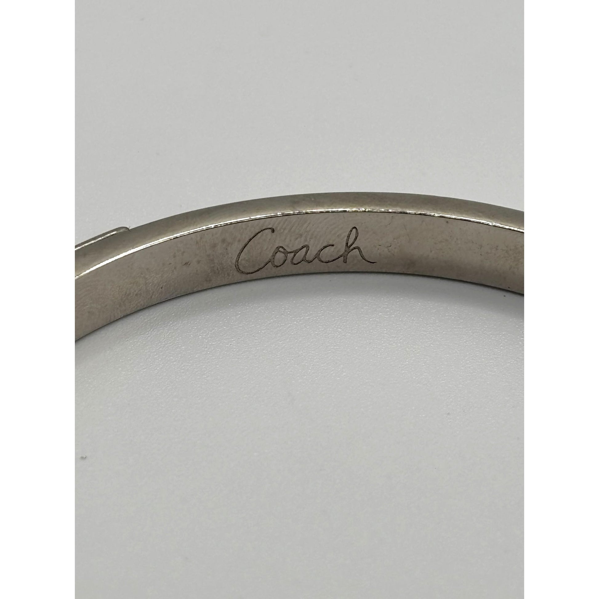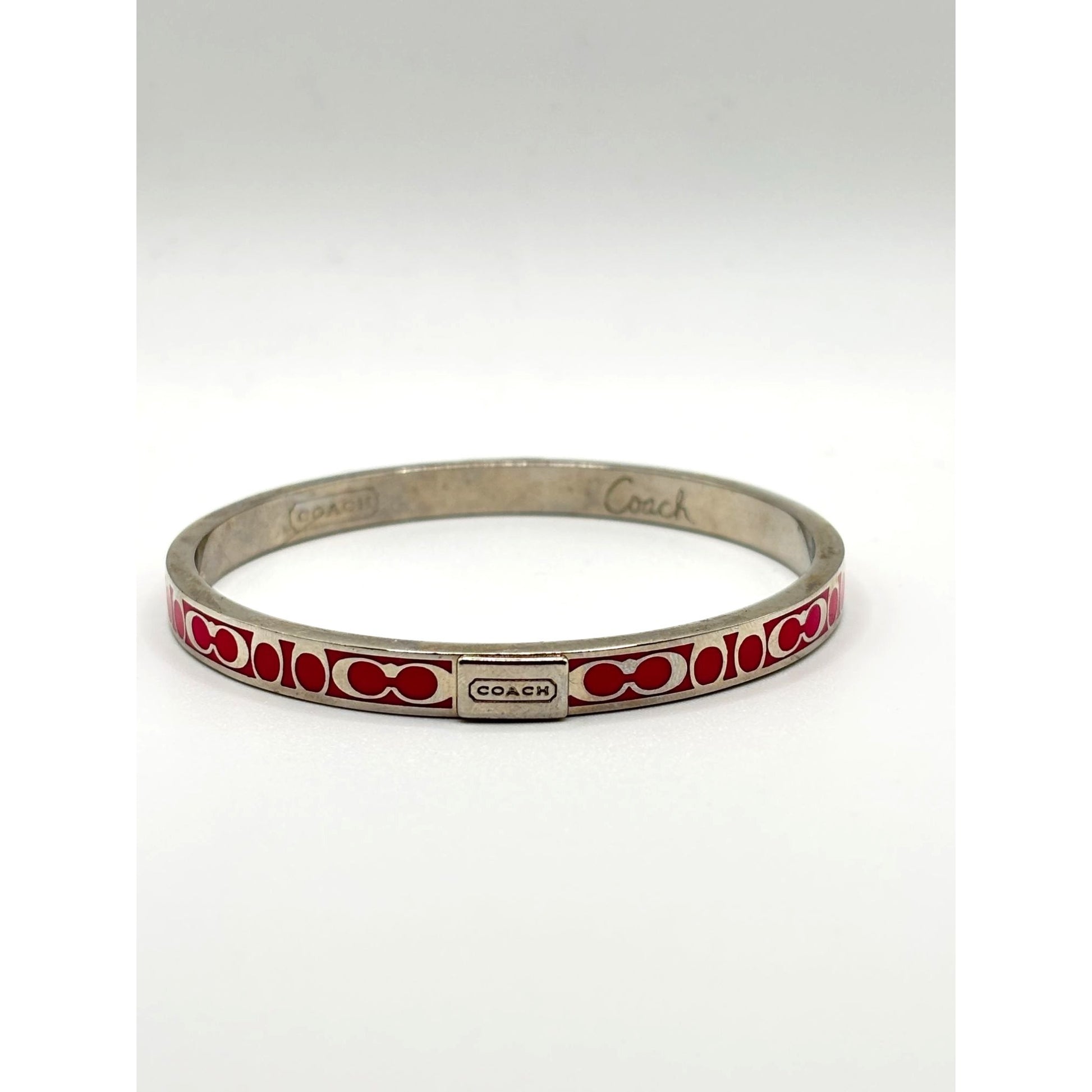 This silver-tone bracelet features Coach's signature pink enamel pattern, offering a stylish and timeless accessory for daily or evening wear.