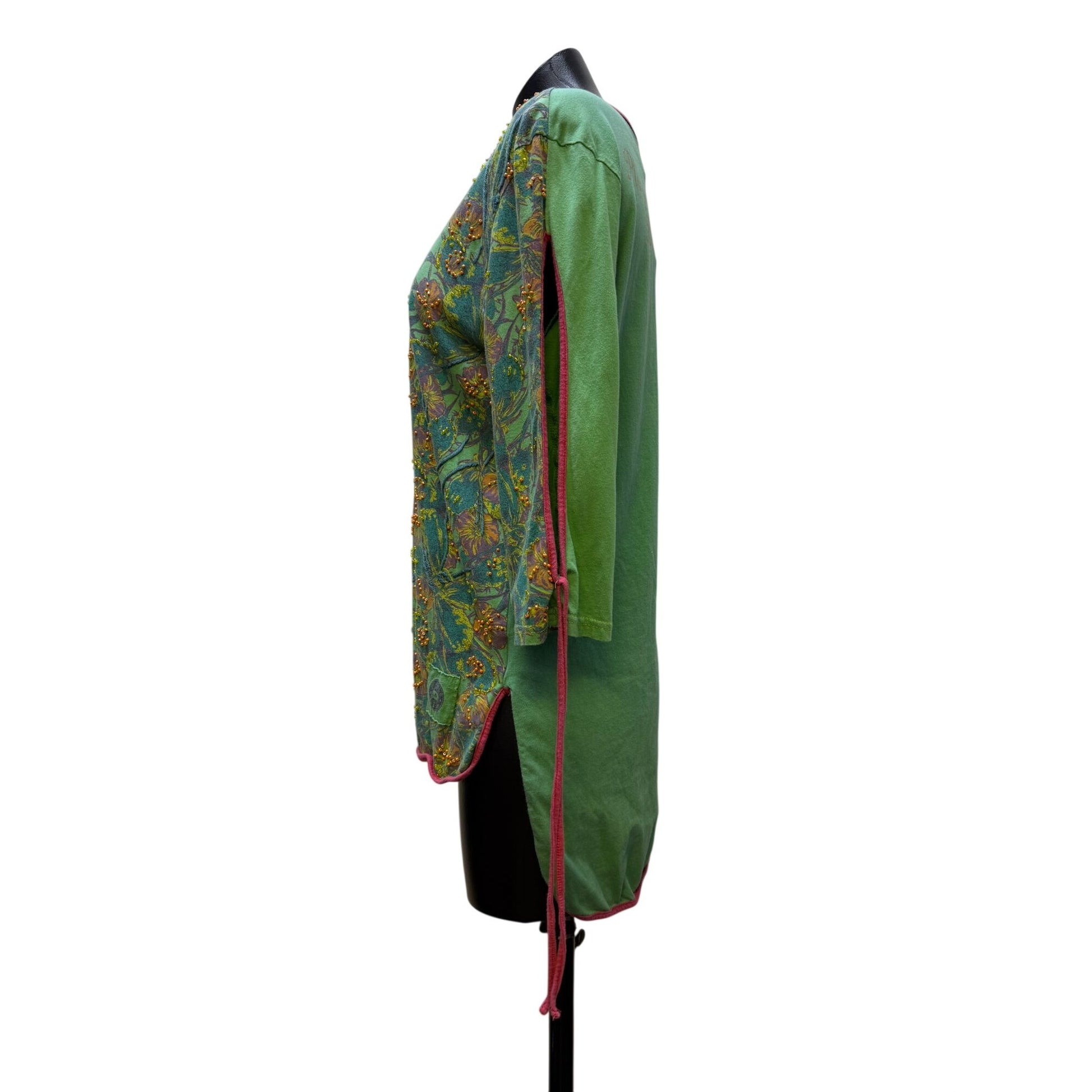 This green blouse features intricate beaded details, 3/4 sleeves with adjustable ties, and an inspiring "Play Nice Be Free" message, offering a stylish yet comfortable fit.