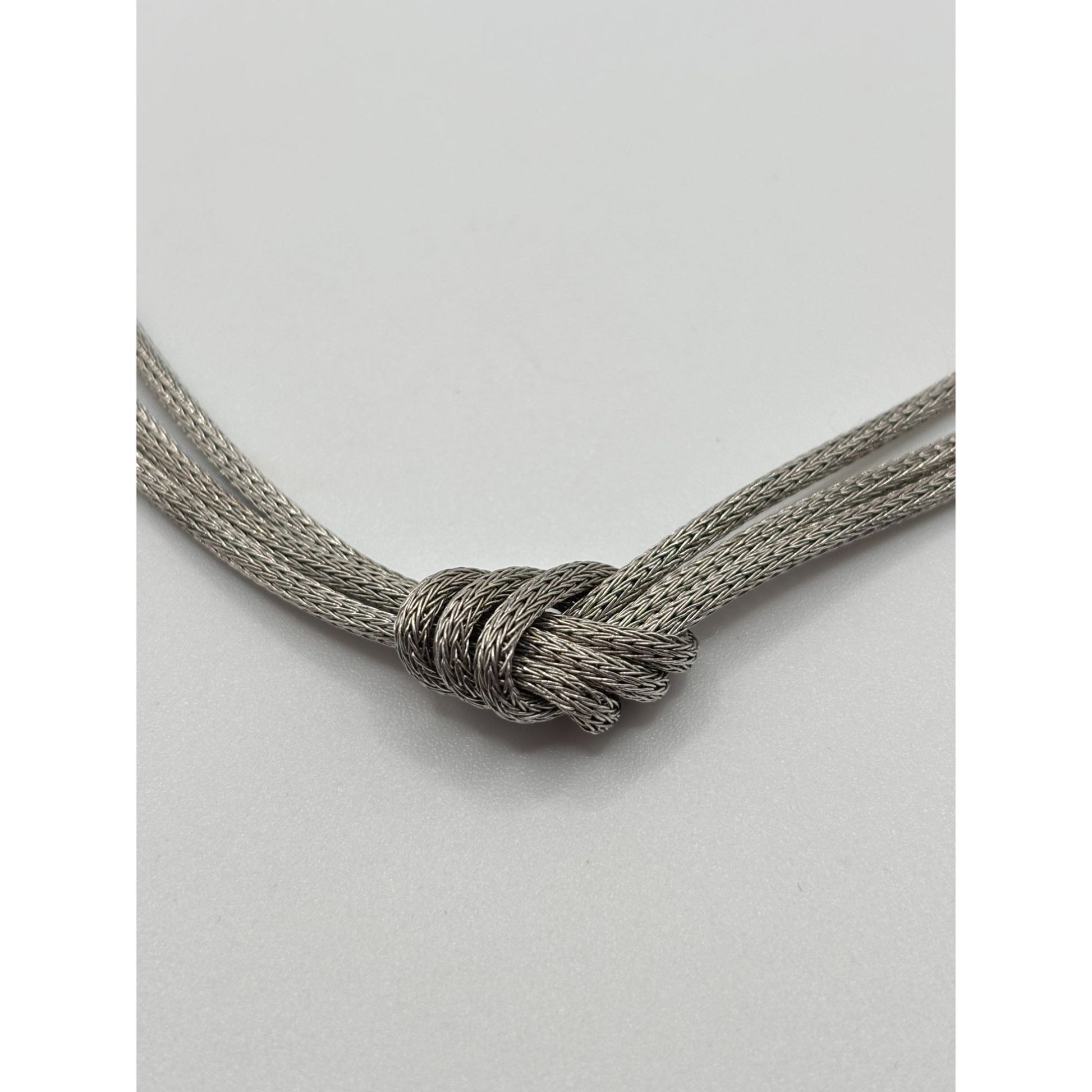 A sophisticated sterling silver necklace featuring an intricate woven mesh chain with a delicate knot detail at the center, offering understated luxury and refined craftsmanship for the discerning wearer.