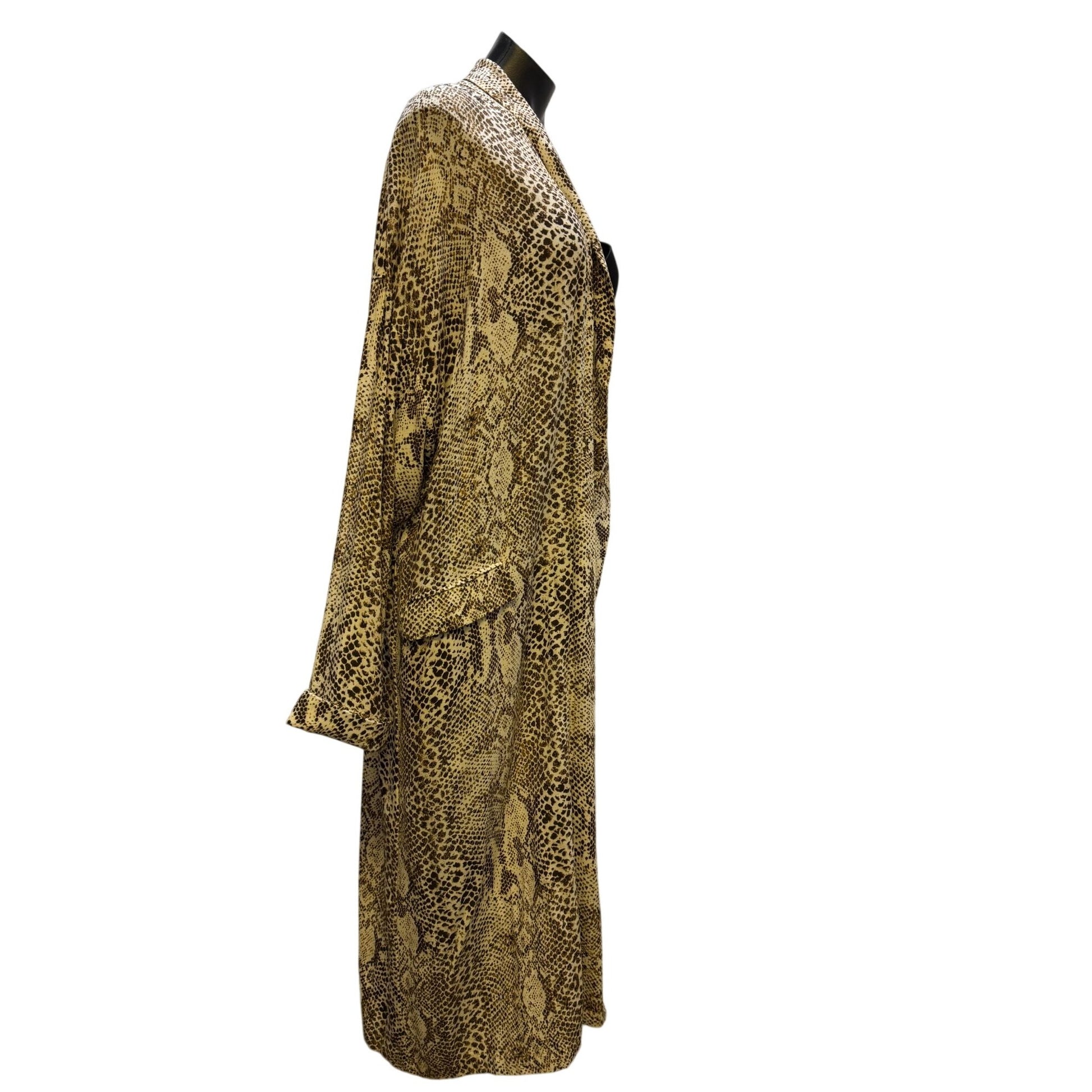 This long duster jacket offers a sleek snake print design, perfect for layering. Crafted from lightweight materials, it provides comfort and style for versatile wear.