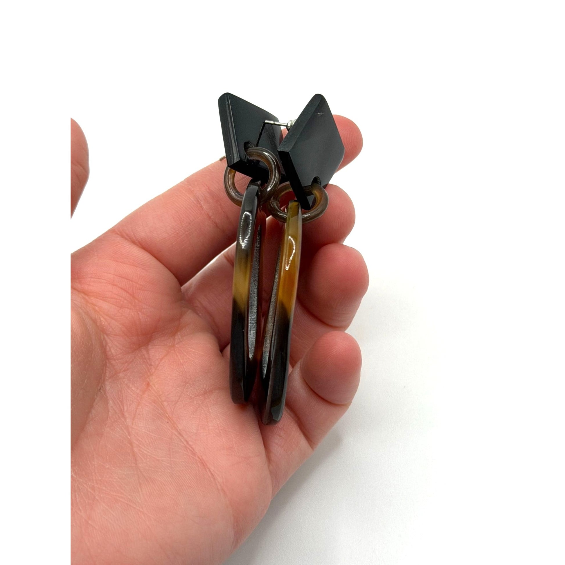 These geometric earrings offer a professional and stylish look. Constructed with resin, they feature open ovals and black diamond-shaped studs.