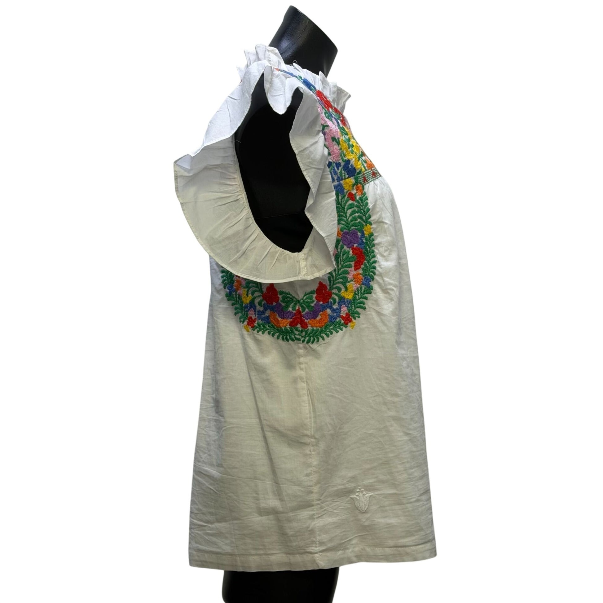 J. Marie White Blouse With Multicolor Floral Embroidery Ruffle Sleeves L