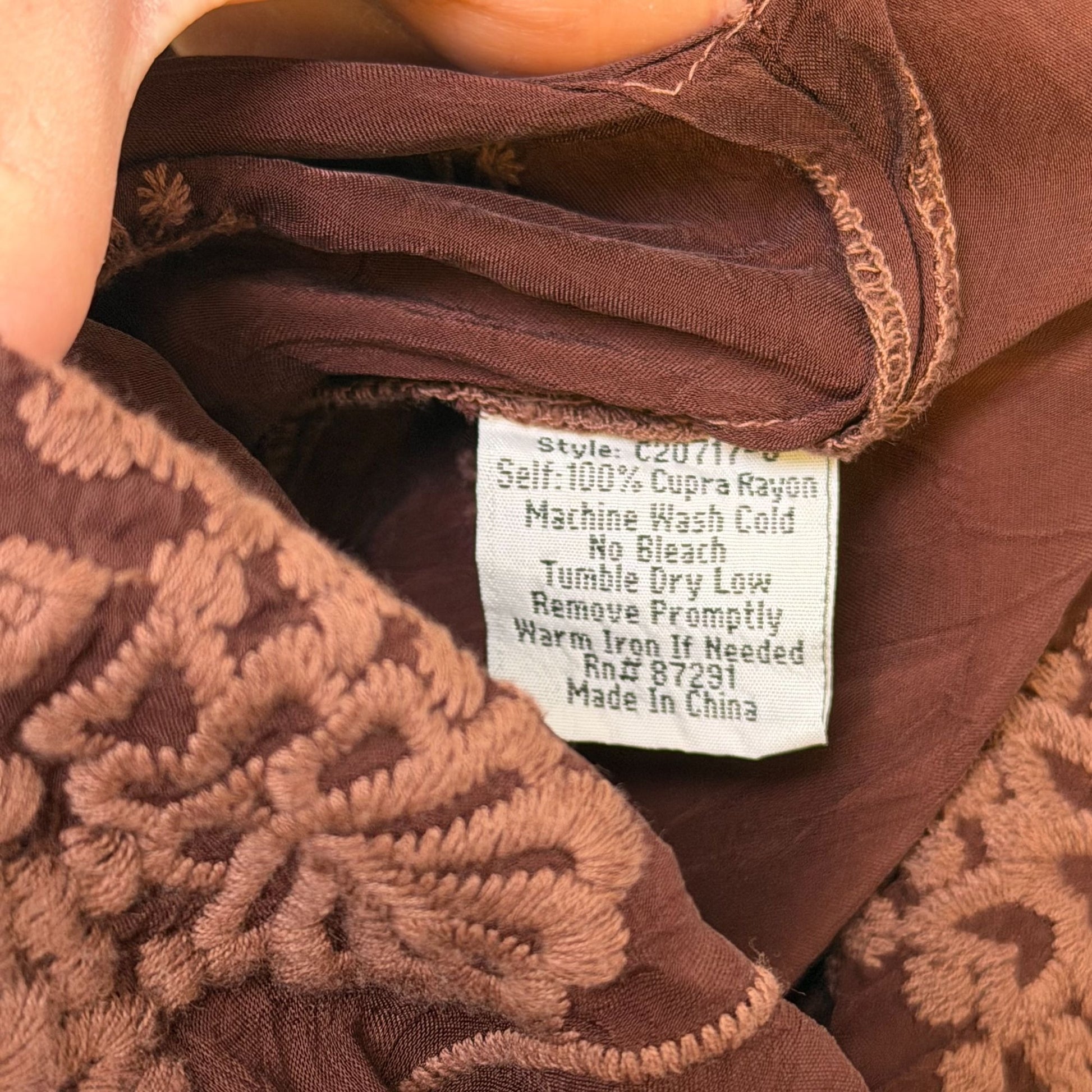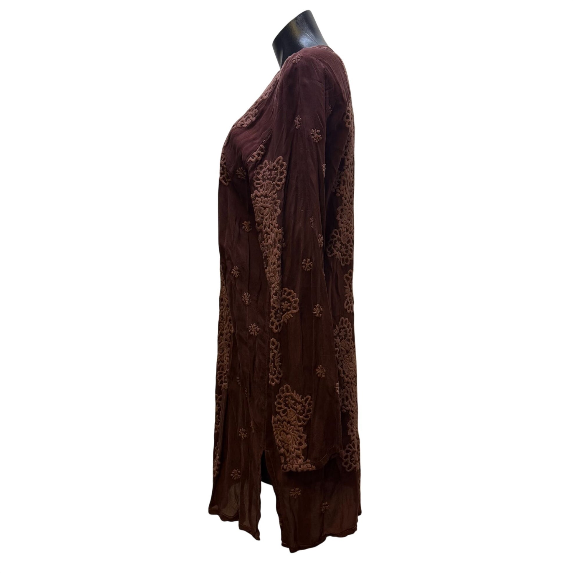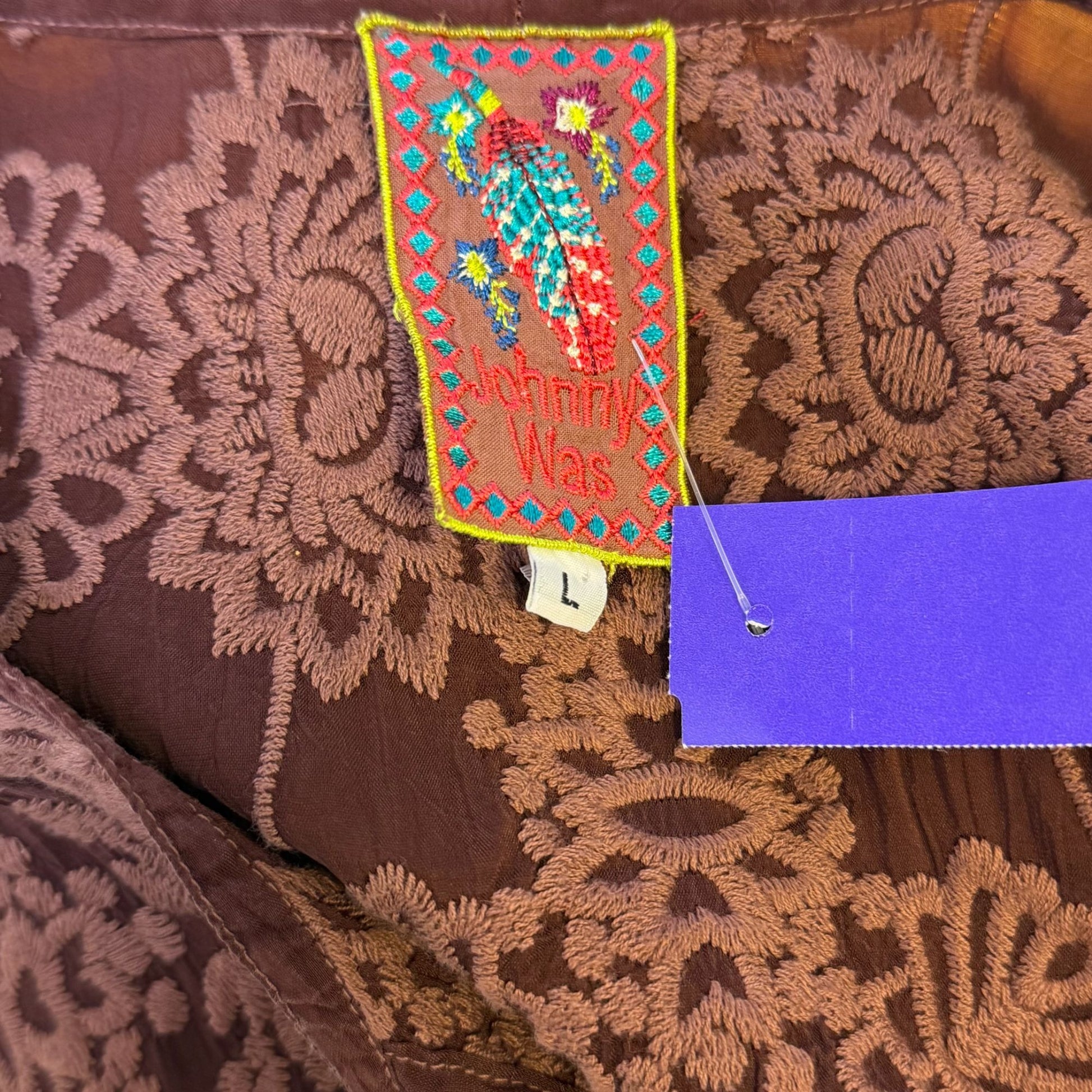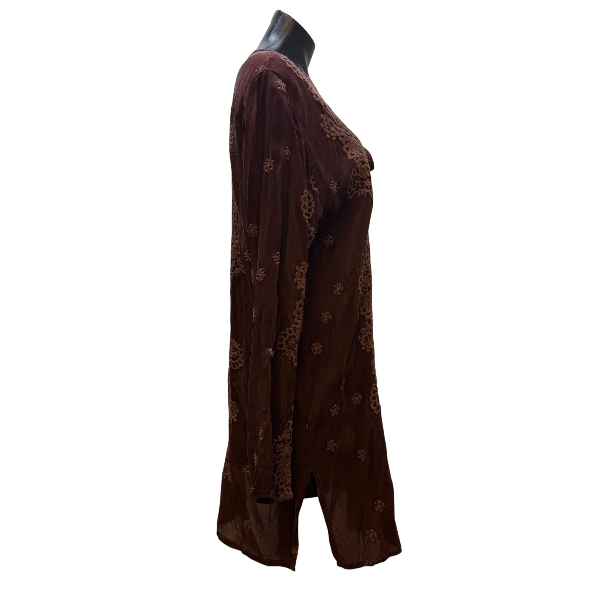 Johnny Was Brown Embroidered Silk Tunic Long Sleeve L