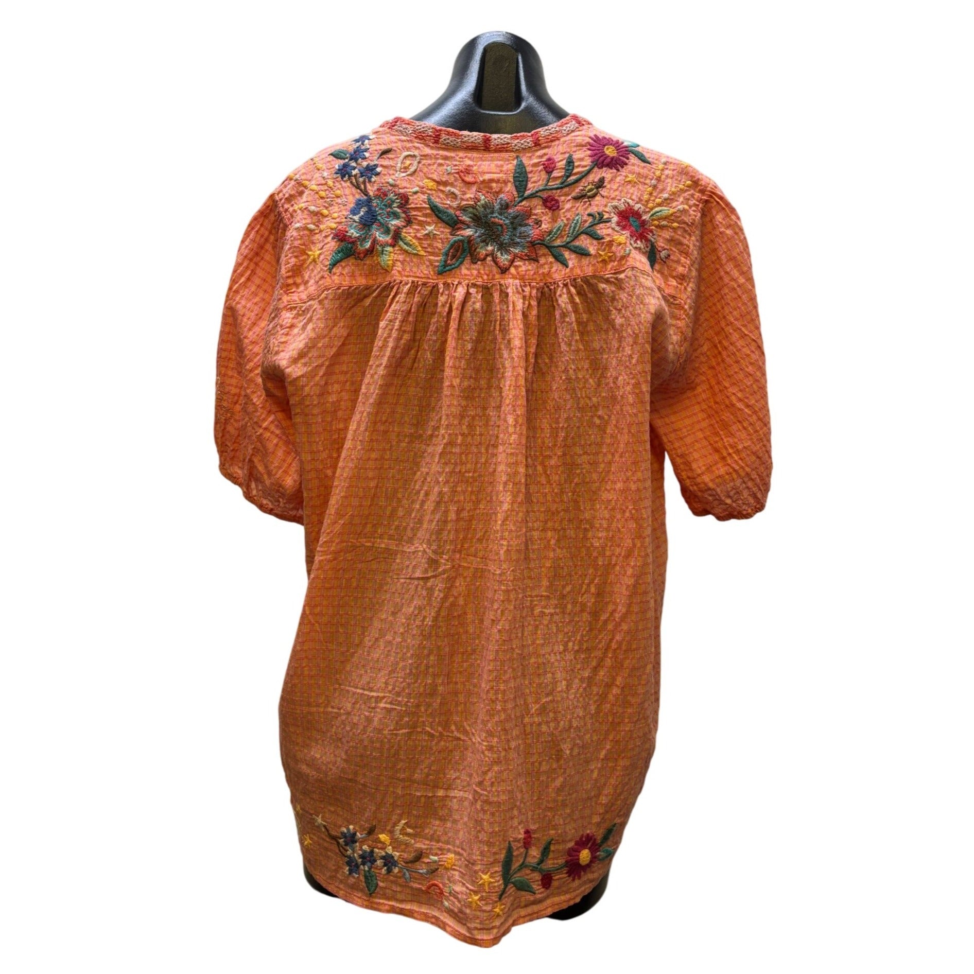 This Johnny Was crinkle top showcases exquisite embroidery with vibrant floral and butterfly patterns. The lightweight fabric and relaxed fit enhance comfort, making it a versatile addition to any wardrobe. Ideal for adding a touch of elegance to casual ensembles or layering in transitional weather.