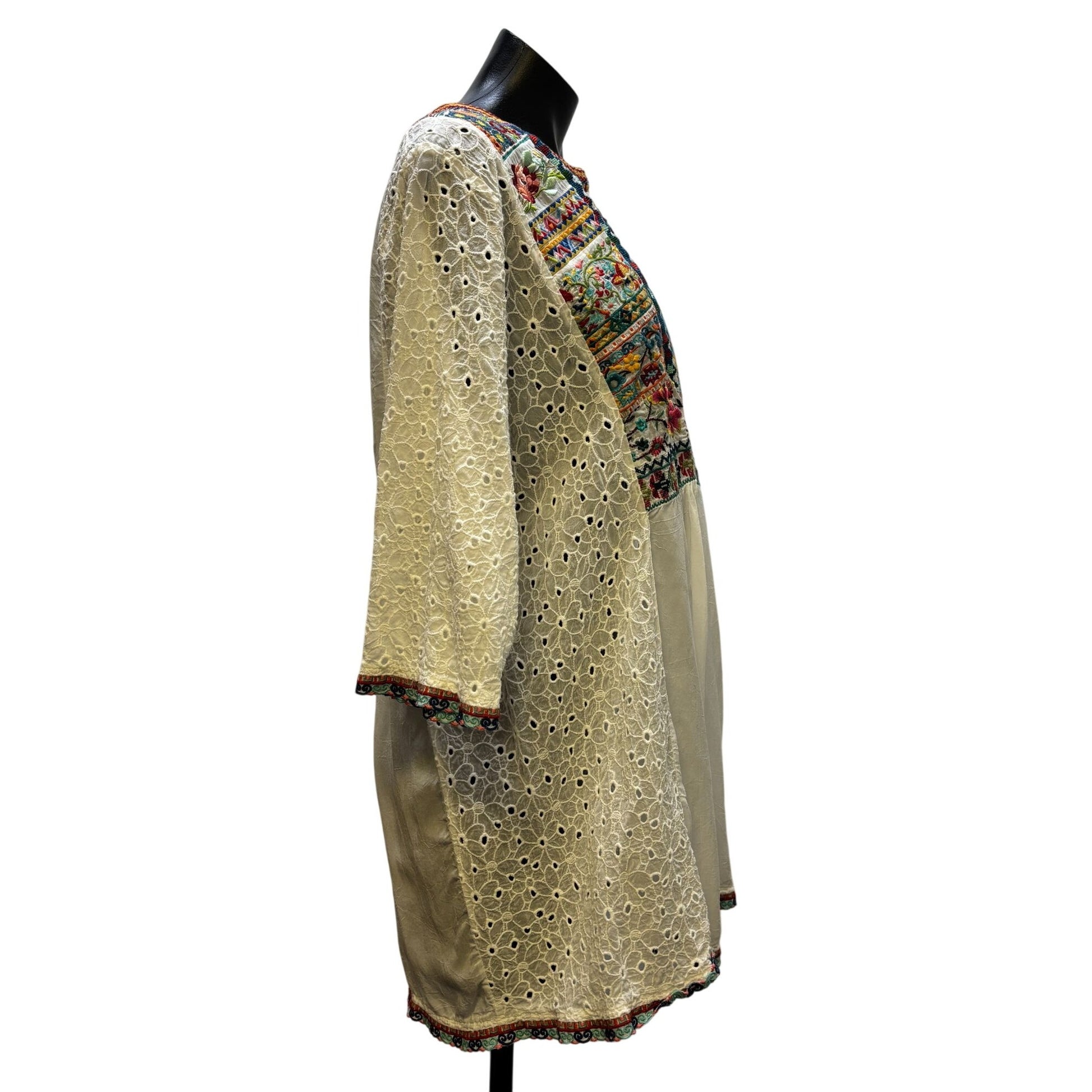 Johnny Was Embroidered Silk Blouse White With Lace Sleeves & Floral Detailing L