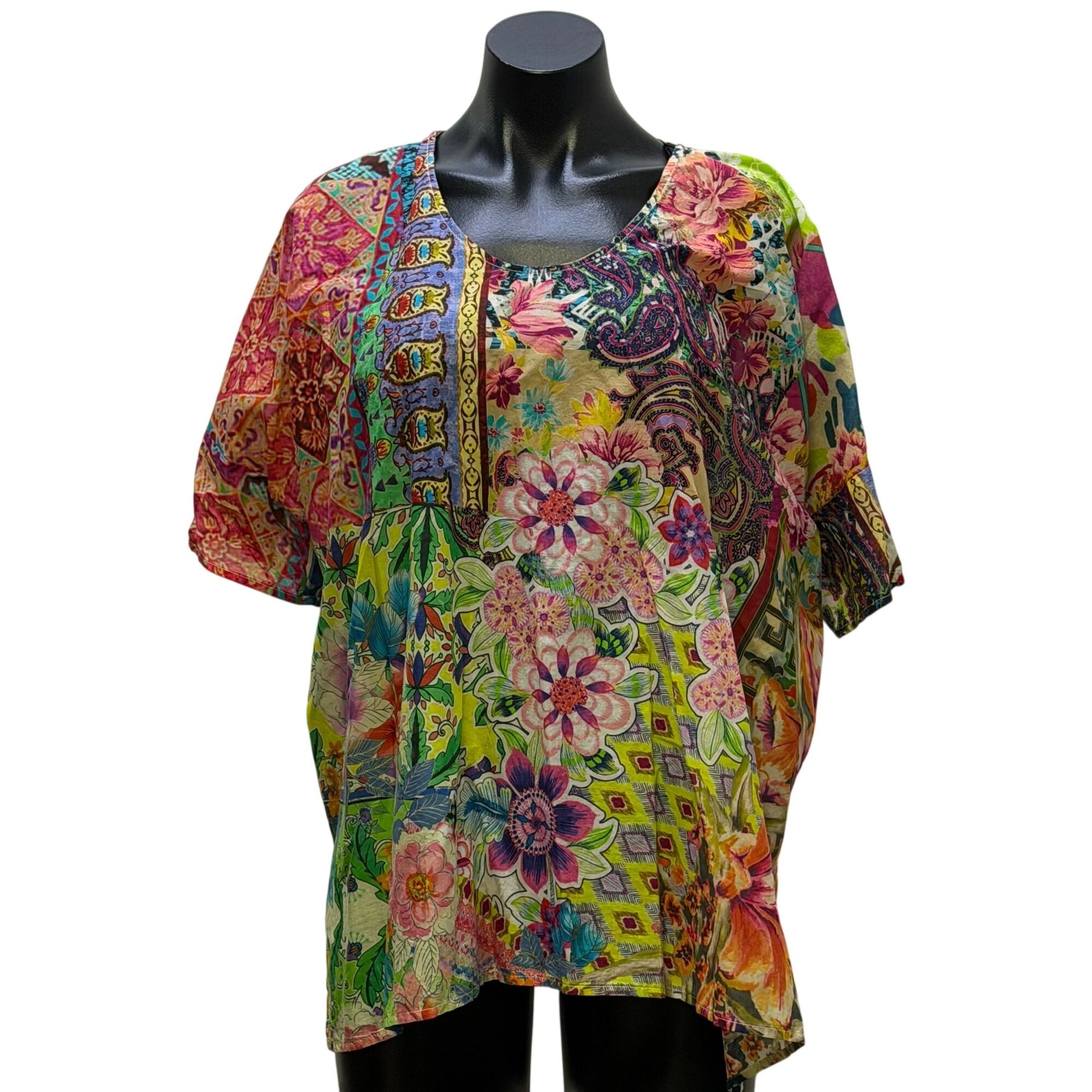 This blouse features a lightweight, flowy design with a vibrant floral and patchwork print. Ideal for an elevated casual or relaxed boho ensemble.