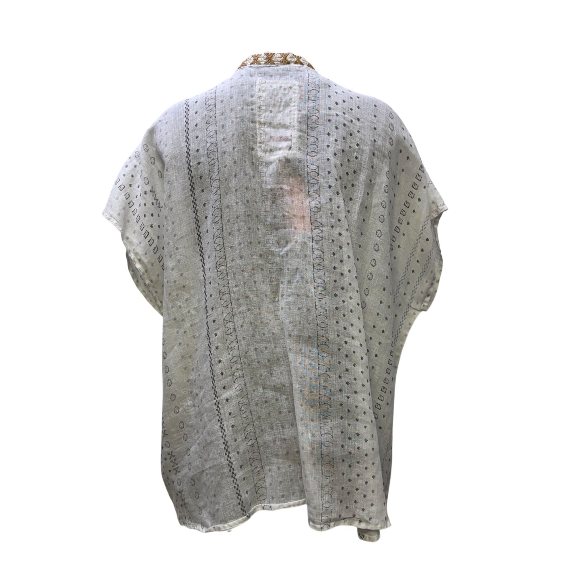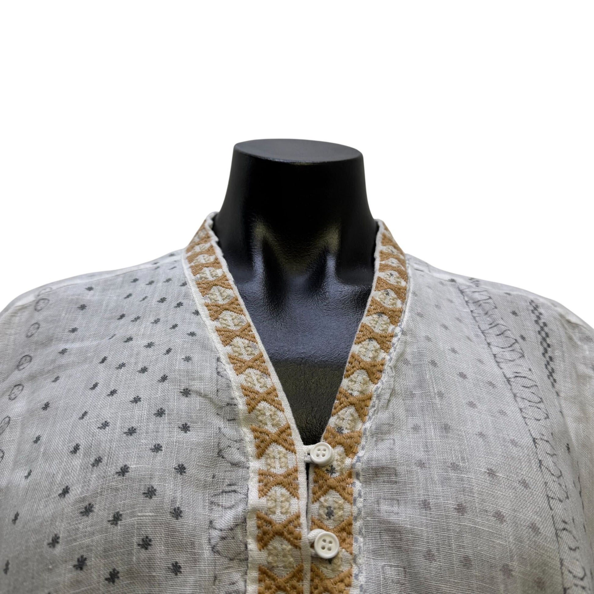 This lightweight linen blouse features intricate floral embroidery, a relaxed fit, and a buttoned neckline. A versatile piece for elevated casual styling.
