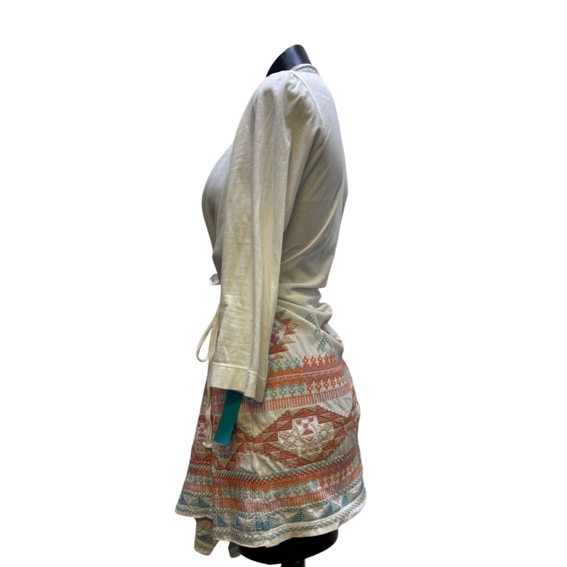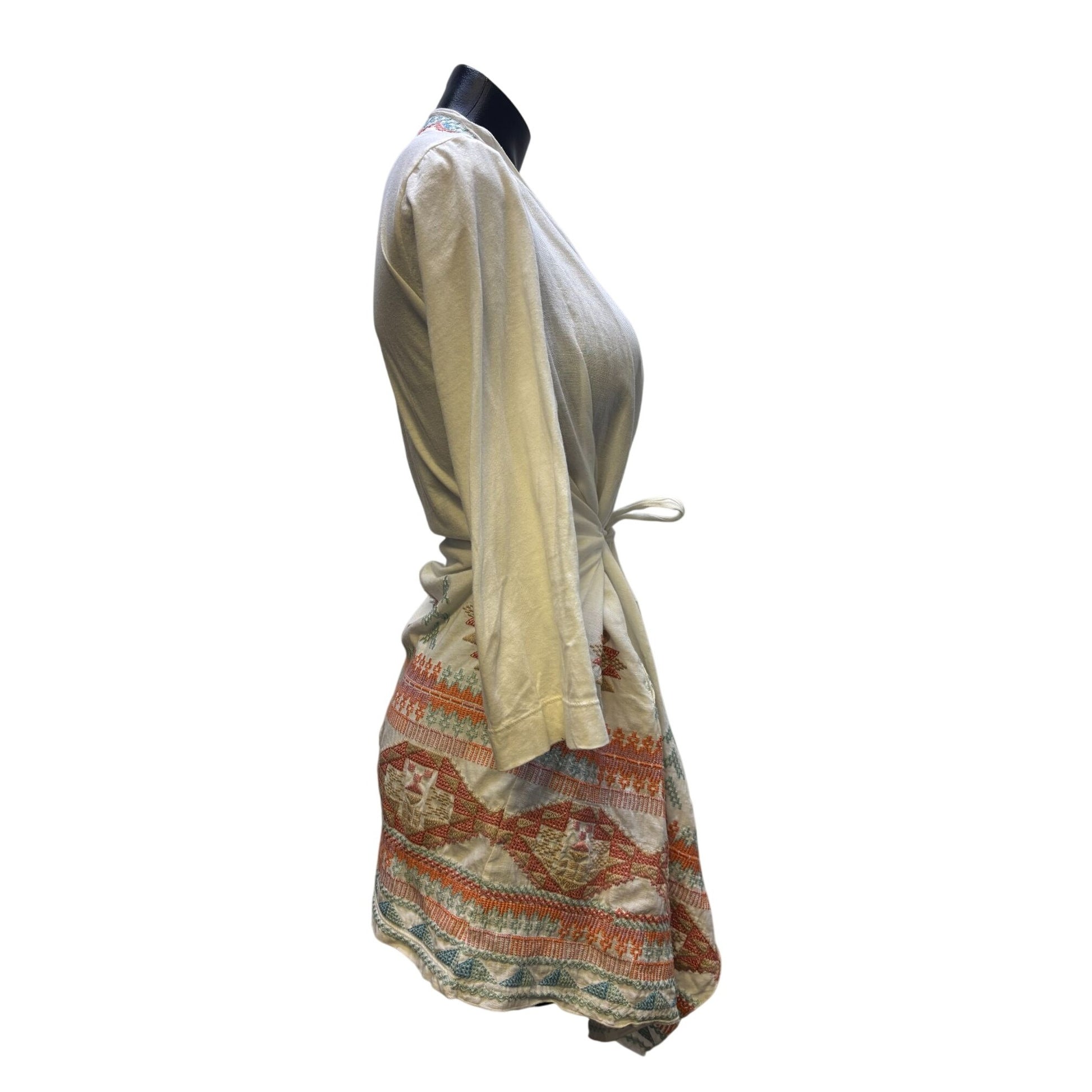 This Johnny Was Los Angeles cardigan features intricate embroidery, enhancing its bohemian aesthetic. Crafted from breathable linen, it offers comfort in style. The tie-front design allows for versatile wear, making it an adaptable addition to your wardrobe. Ideal for layering, it combines elegance with casual ease.