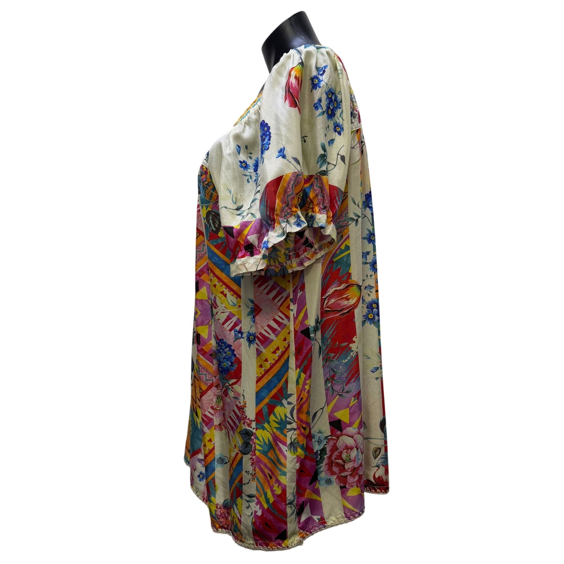 Crafted from luxurious silk, this blouse features vibrant floral and geometric patterns with intricate embroidery. Its square neckline and loose fit offer both style and comfort.