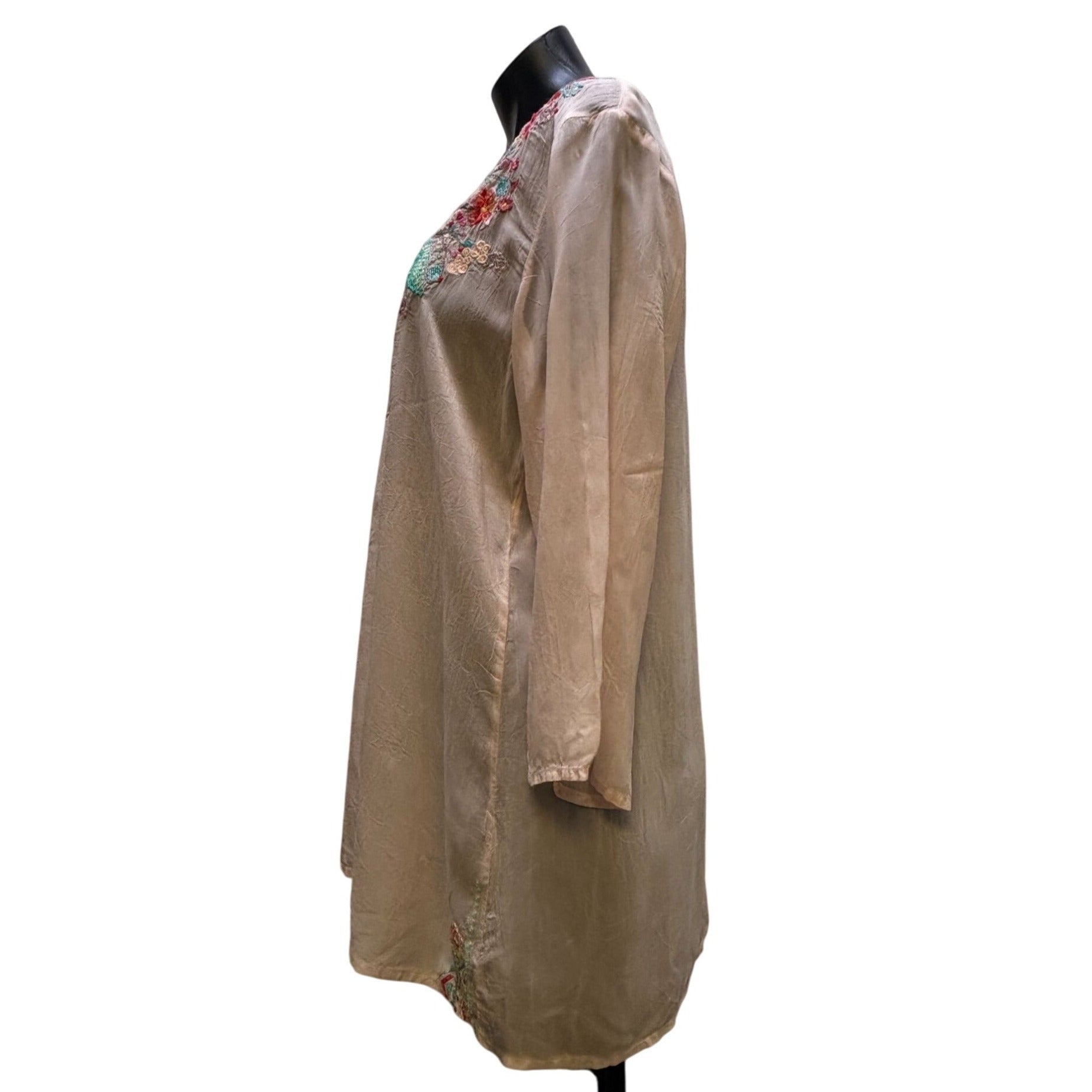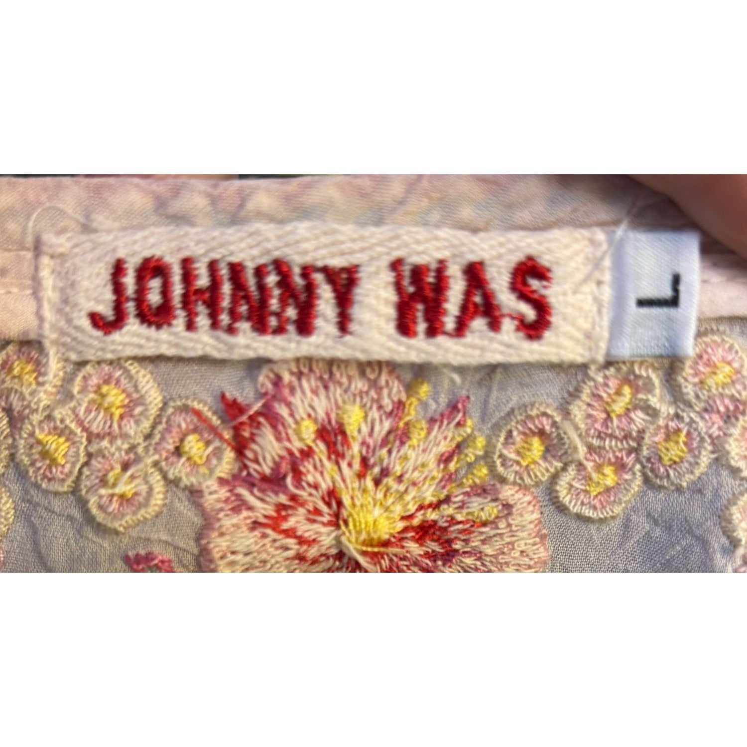 This luxurious Johnny Was blouse features intricate floral embroidery on a soft pink silk fabric. The elegant design and high-quality material offer a sophisticated look suitable for professional settings. Its relaxed fit and lovely details make it a versatile addition to any wardrobe.