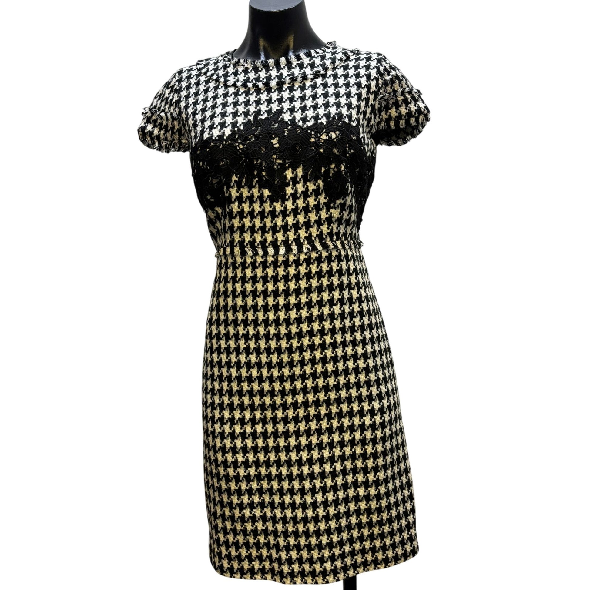 This Karl Lagerfeld dress offers a sophisticated houndstooth pattern complemented by black lace detailing. Its classic silhouette is tailored for a refined look.