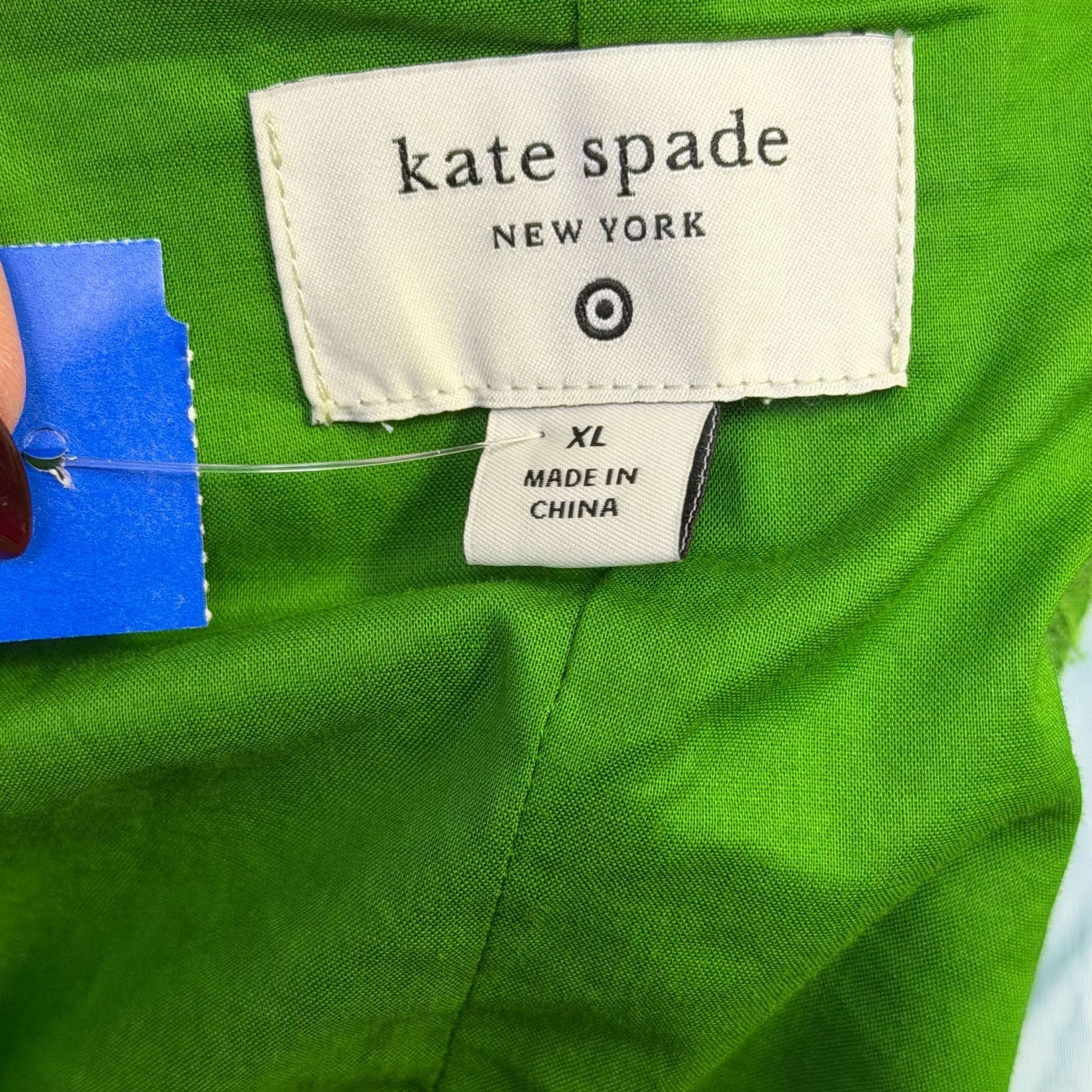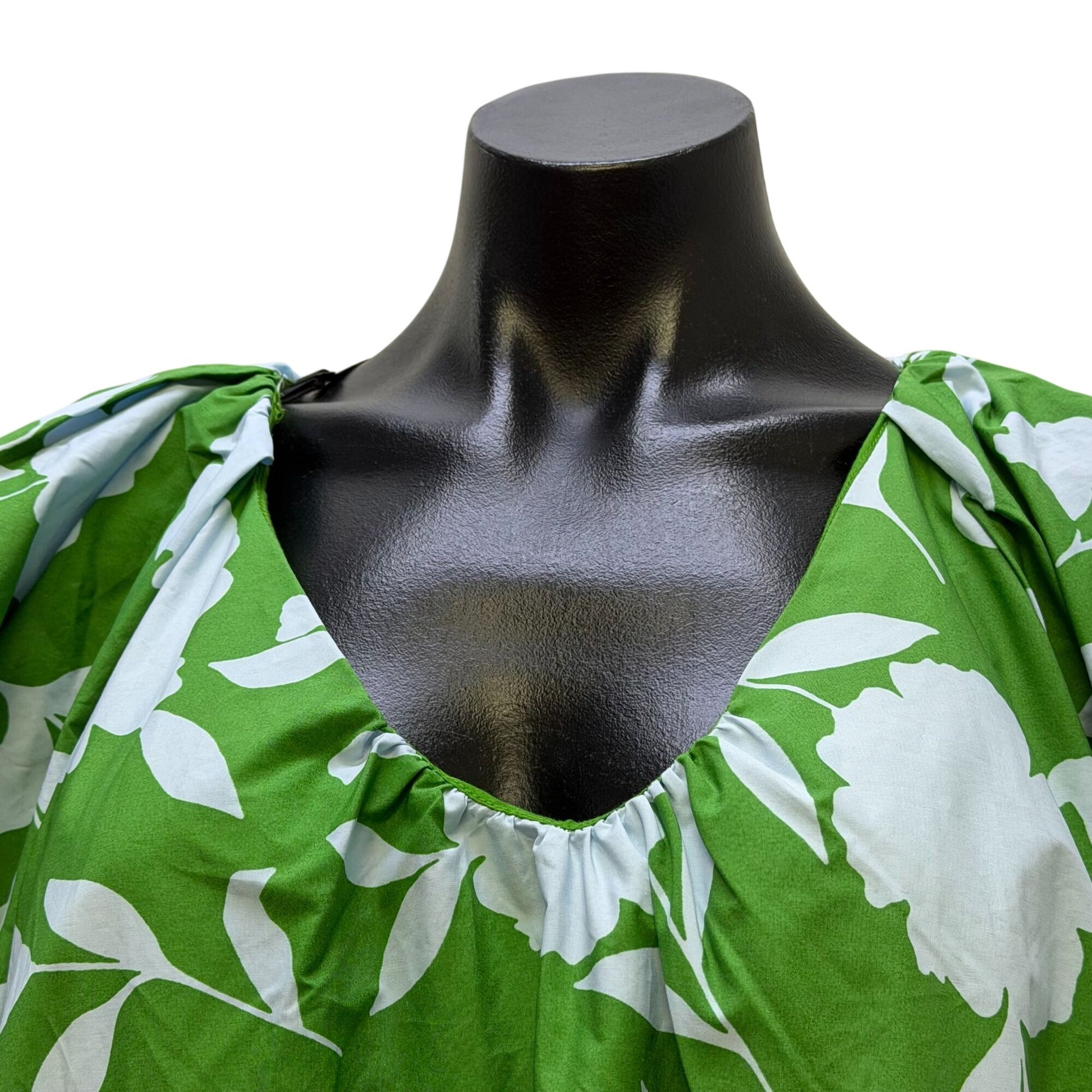 This Kate Spade dress features a bold green and white floral pattern. Designed with a loose fit and long sleeves, it offers comfort and style.