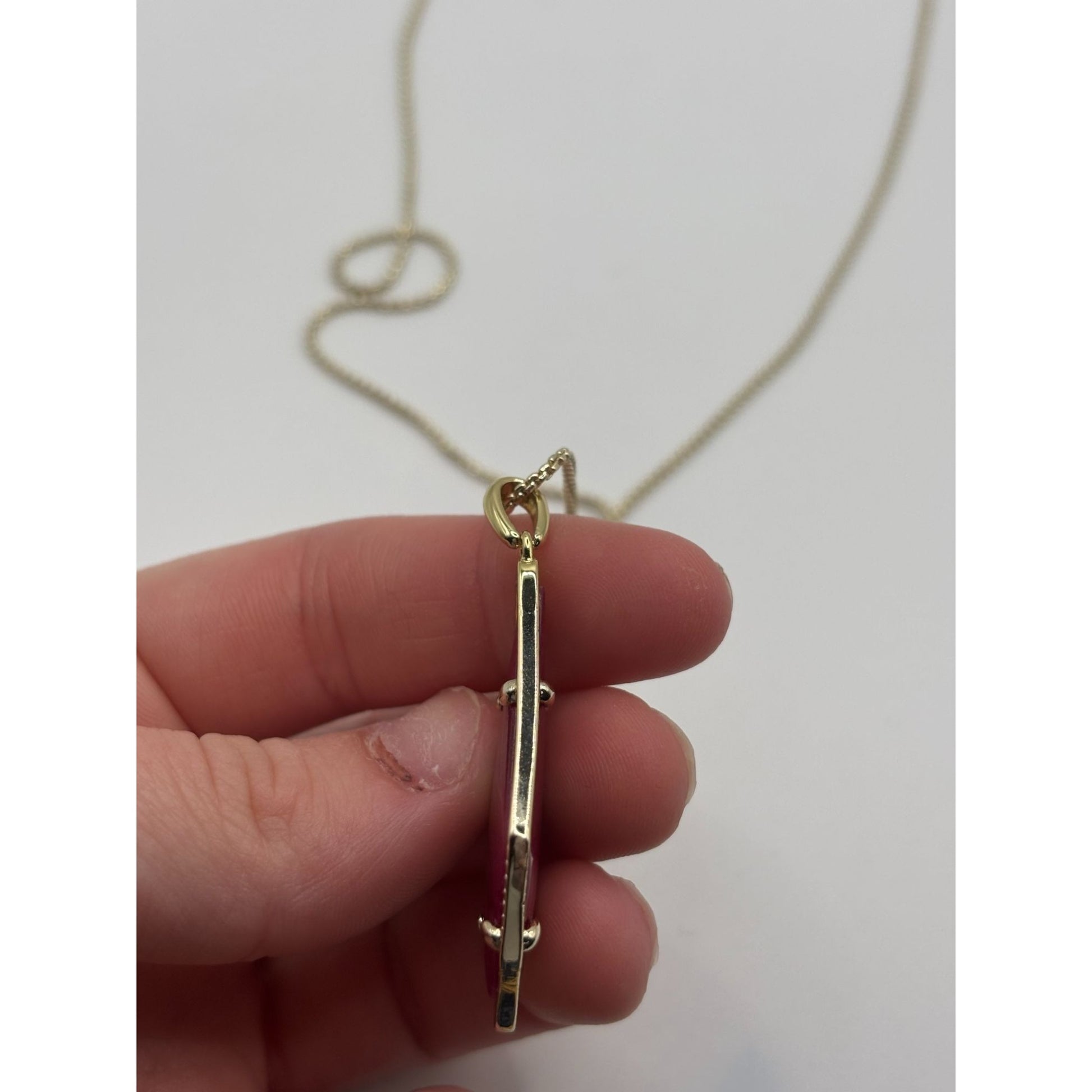 This Kendra Scott necklace features an elegant gold chain with a vibrant magenta stone pendant. Its sophisticated design complements both formal and casual attire, embodying timeless style with modern flair.