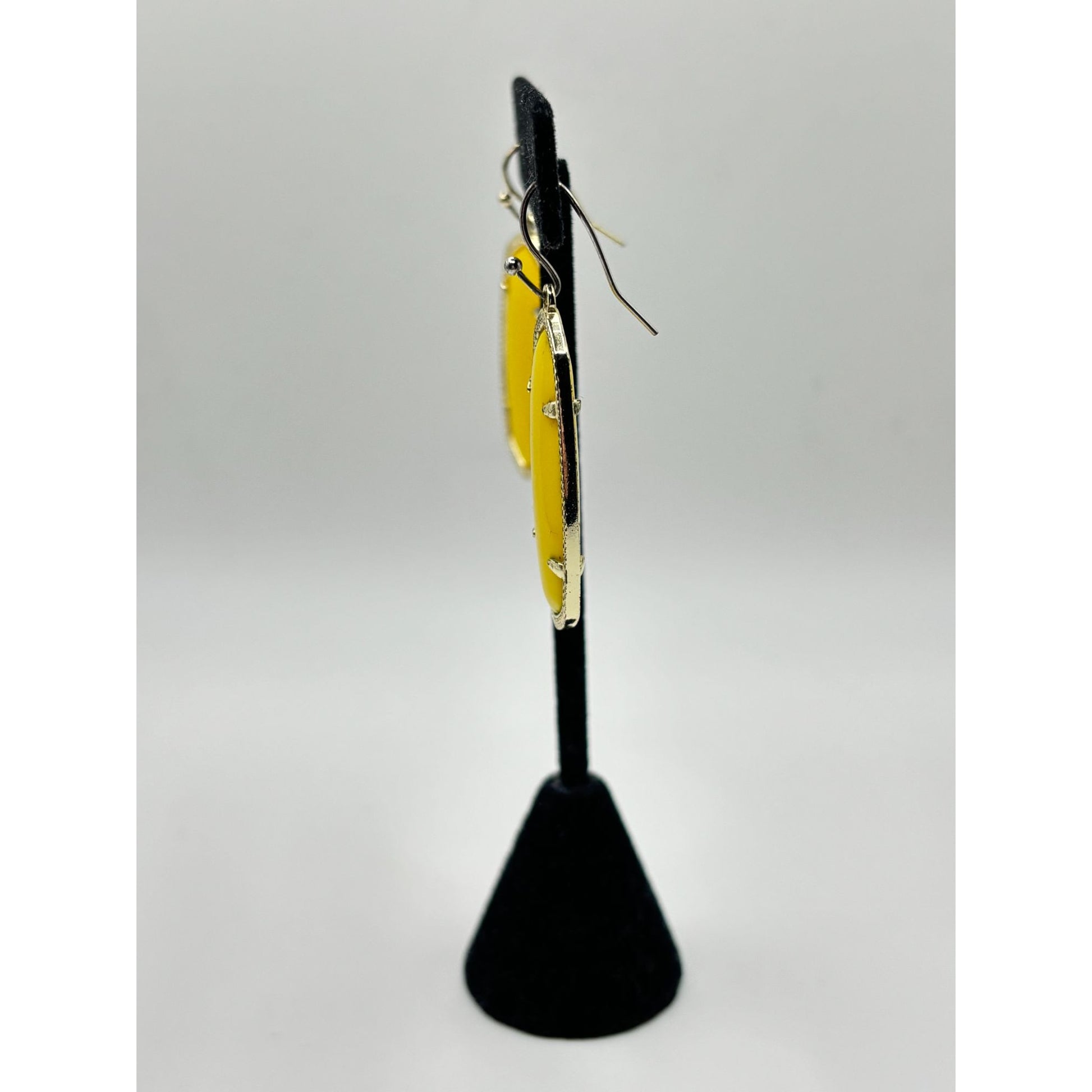 These earrings feature a vibrant yellow glass stone encased in silver-plated metal, offering a sophisticated, lightweight option for both casual and formal wear.