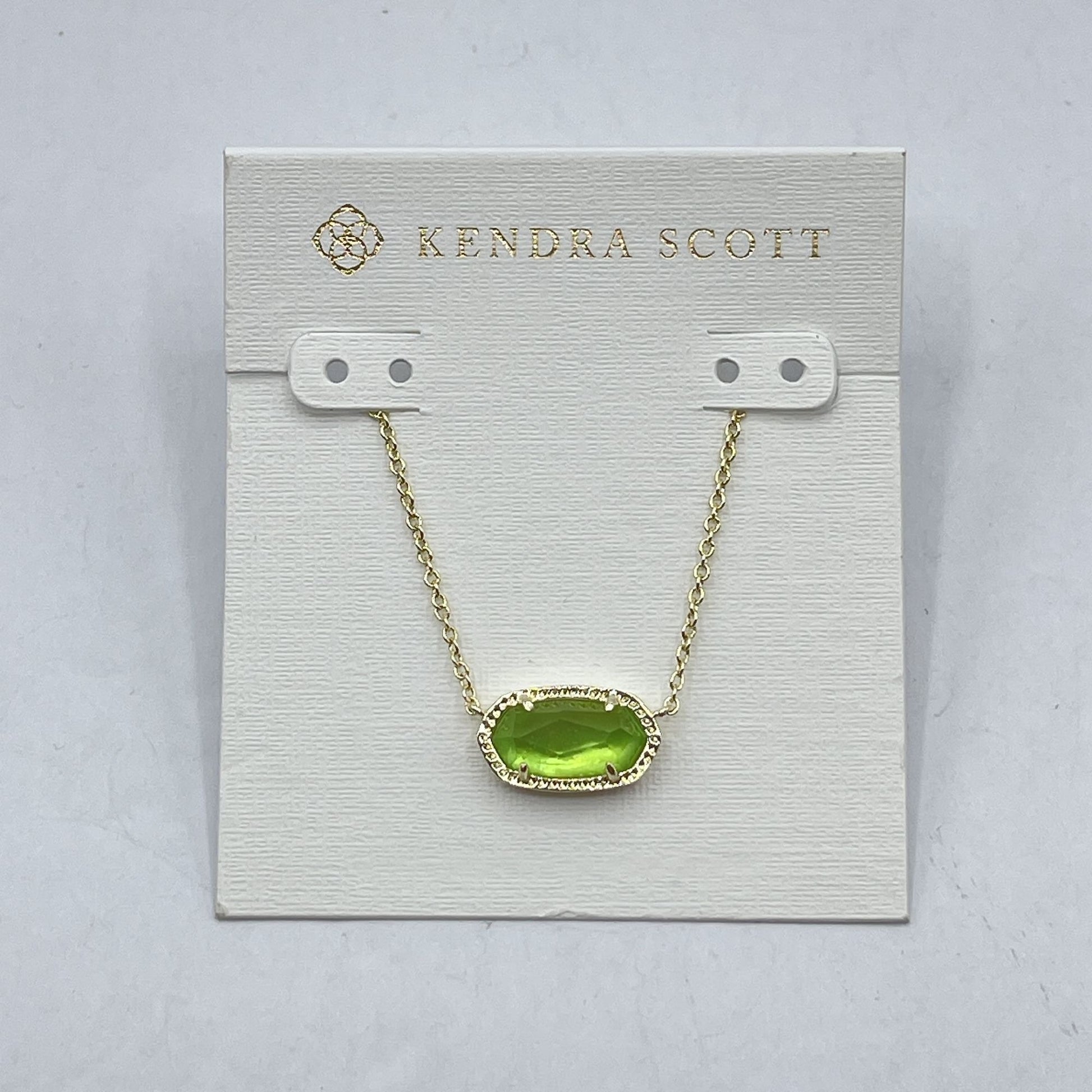 This Kendra Scott necklace features a striking green gemstone pendant, elegantly framed in gold-plated metal. The timeless design and fine craftsmanship make it a versatile accessory for various attire. Ideal for those seeking to add a touch of sophistication to their ensemble.