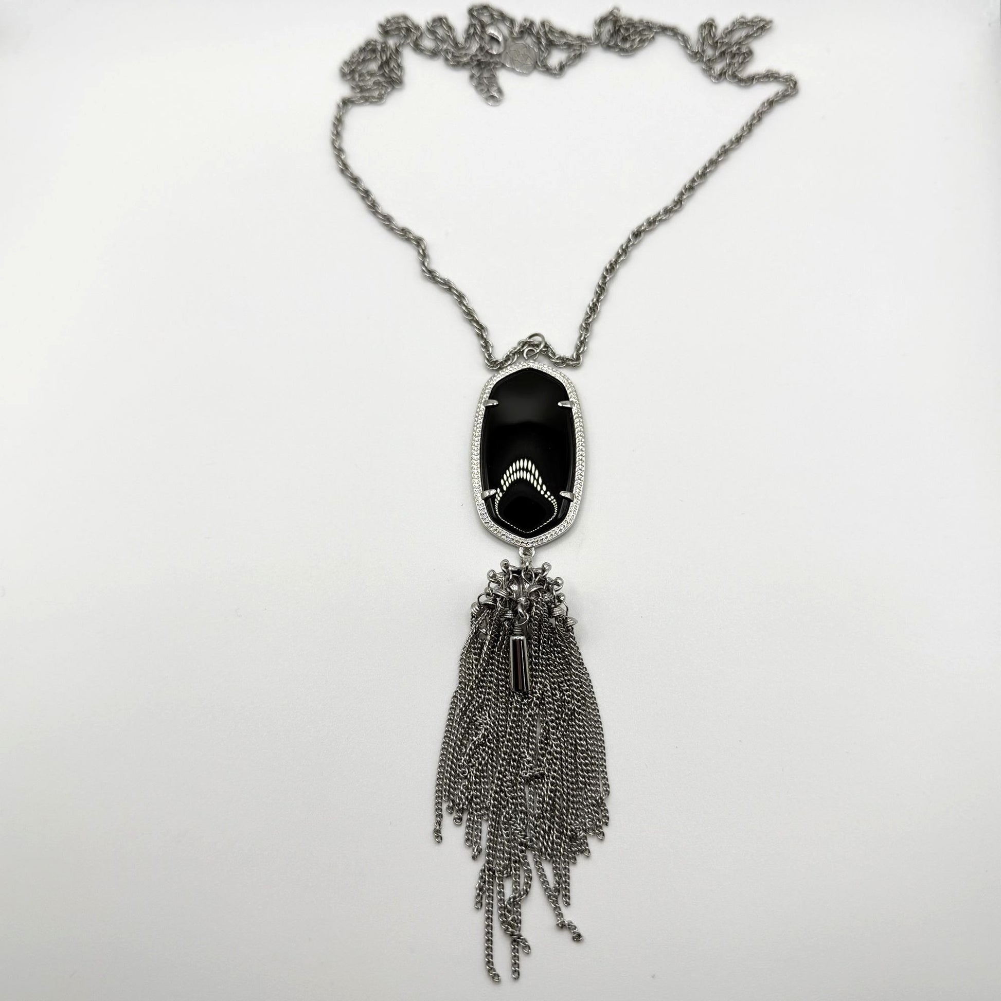 This Kendra Scott necklace features a polished black stone set in a silver-tone frame with a long tassel accent, offering elegant sophistication.