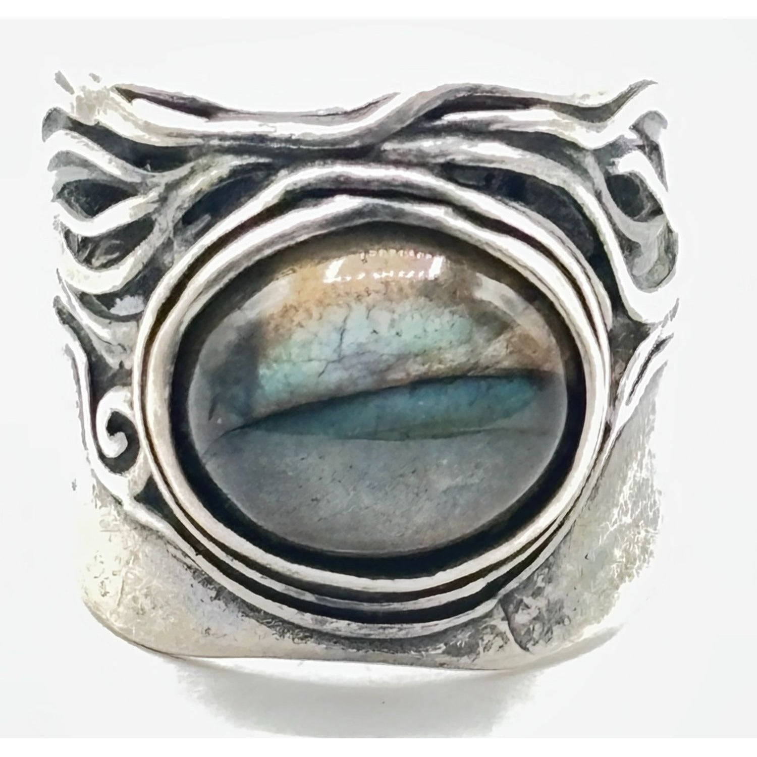 This artisan ring features a captivating labradorite gemstone set in sterling silver. Its intricate design and craftsmanship reflect a unique, artistic flair. Sourced from Israel, this piece is both a statement and a testament to quality. Perfectly suited for those who appreciate elegance and timeless beauty.