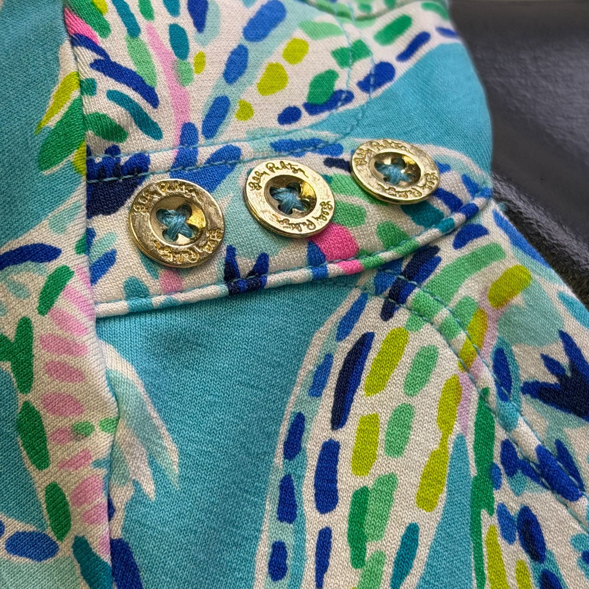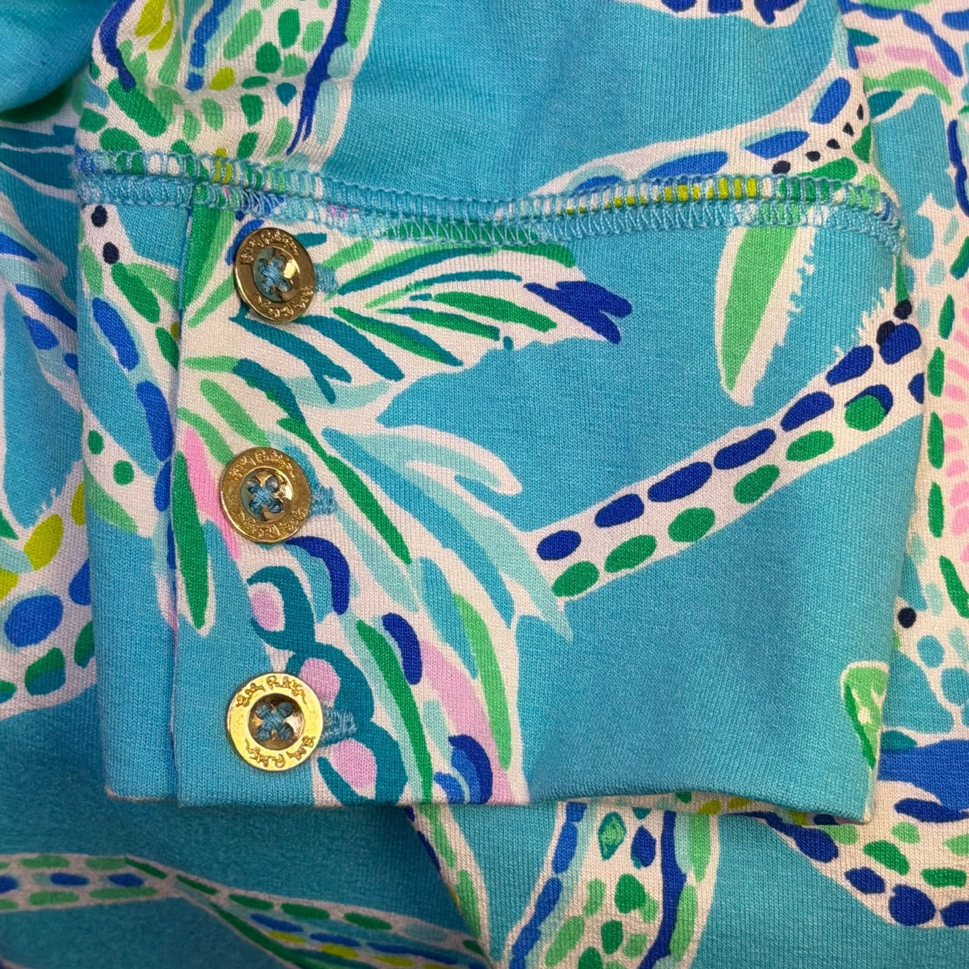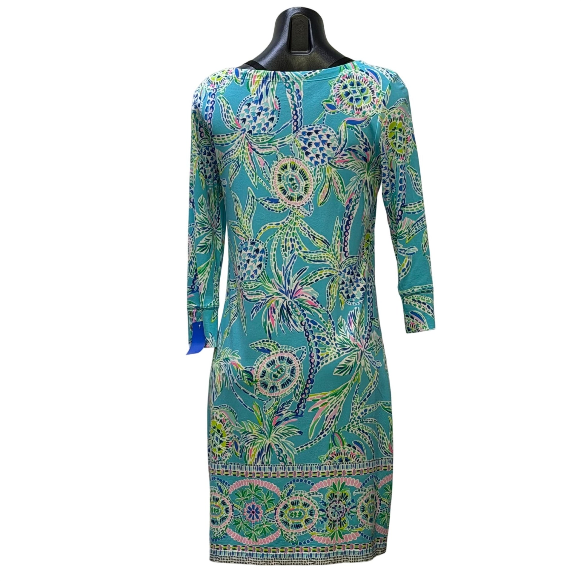 This Lilly Pulitzer dress features a vibrant tropical print in turquoise with 3/4 sleeves and gold button accents, offering both style and comfort.