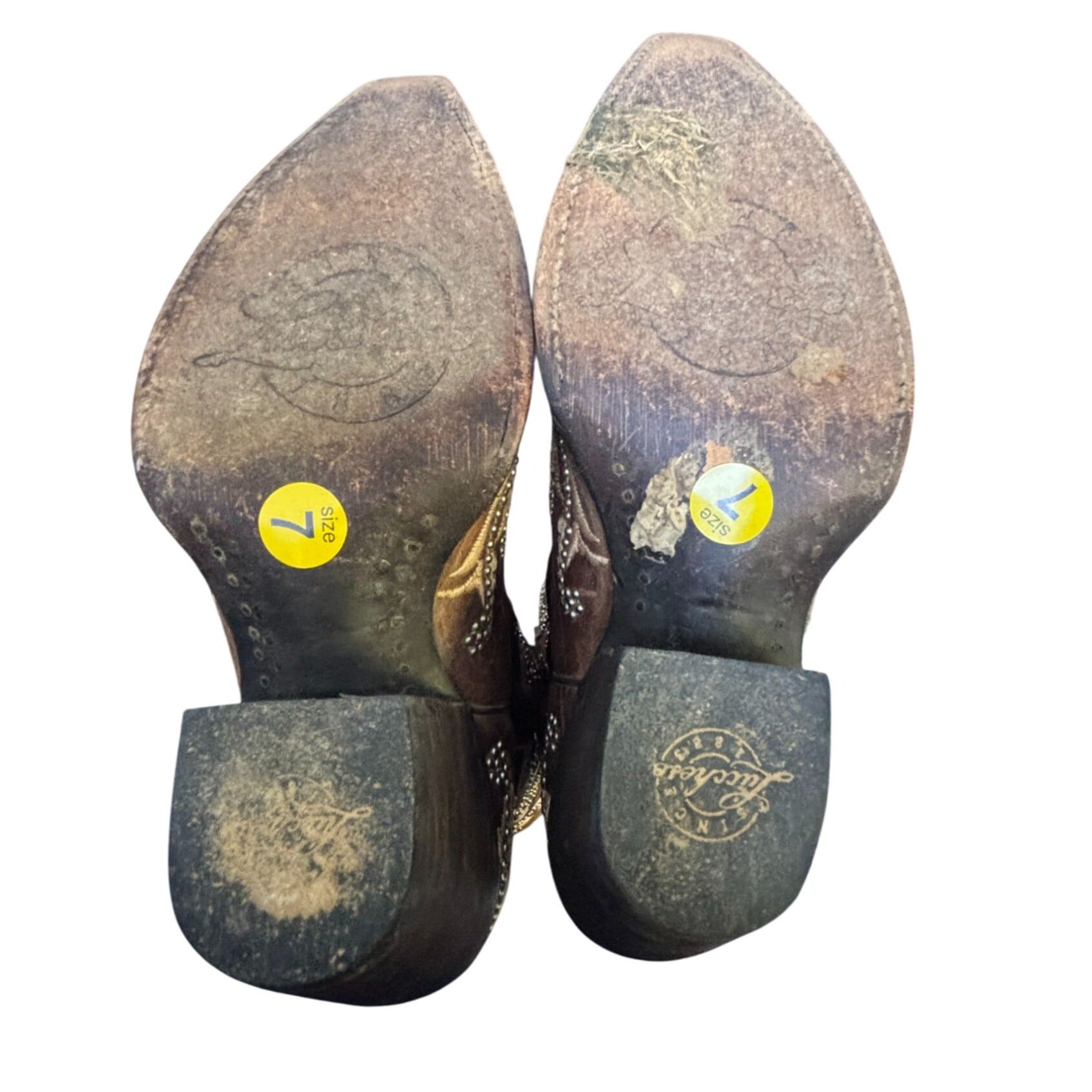 These Lucchese Western boots feature intricate embroidery and stud detailing, offering a stylish yet durable option for those who appreciate classic Western aesthetics. Crafted from high-quality leather, these boots not only provide a comfortable fit but also ensure long-lasting wear. Ideal for those who value both fashion and functionality.