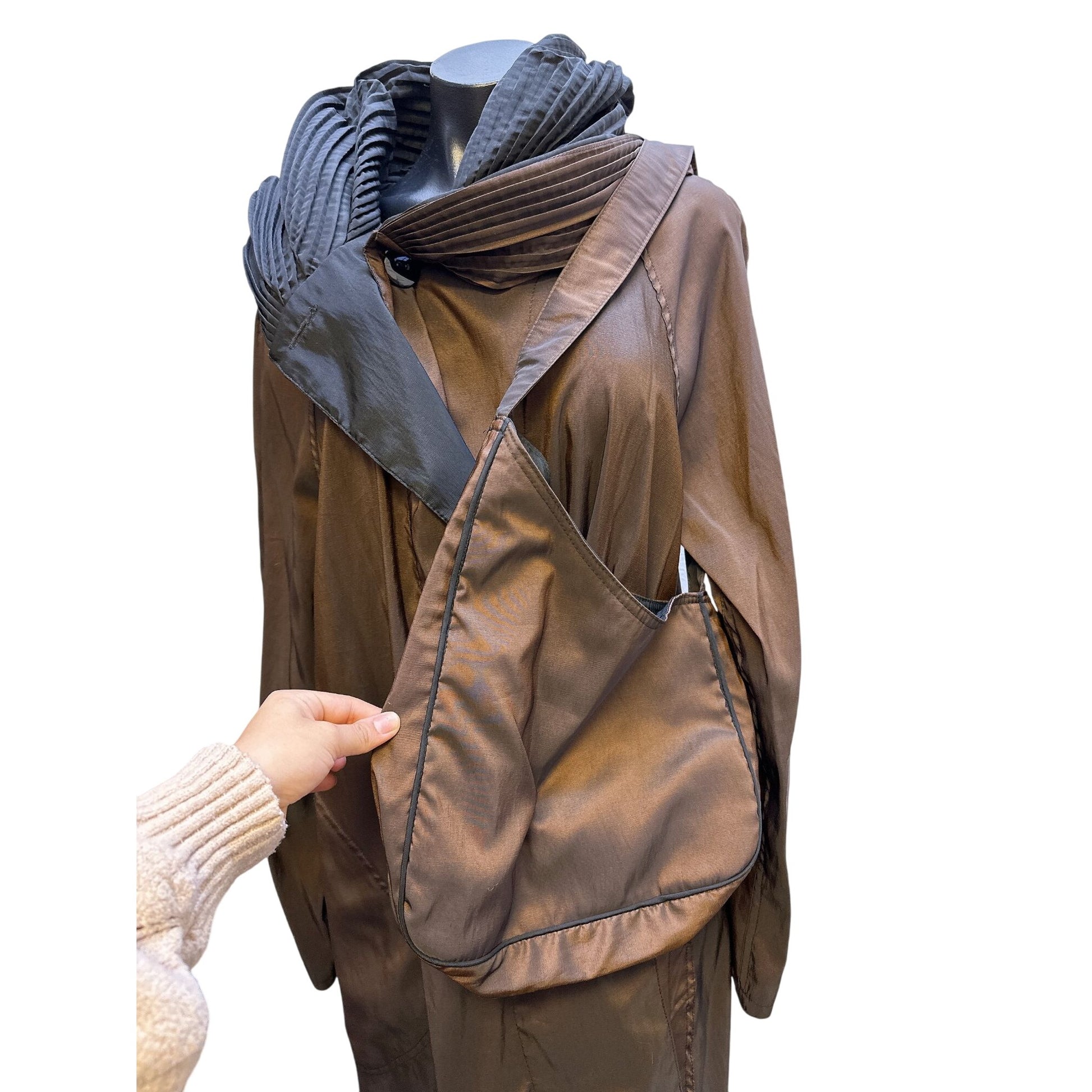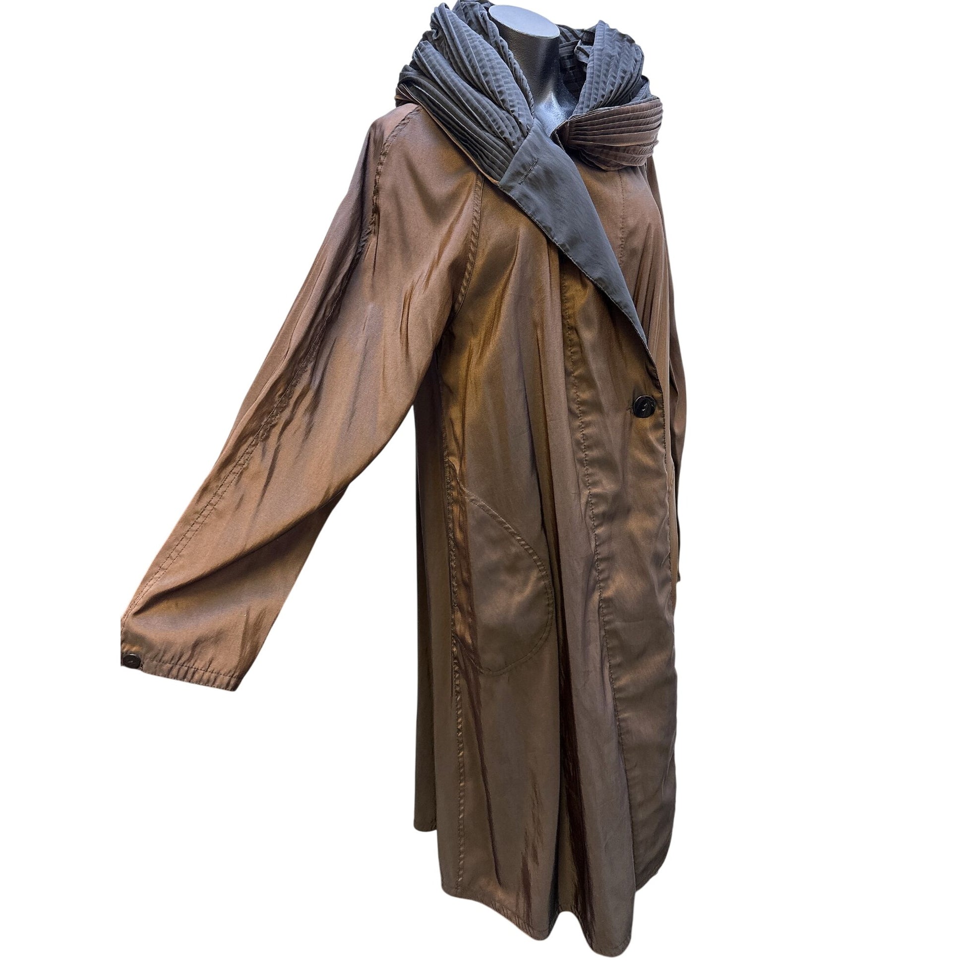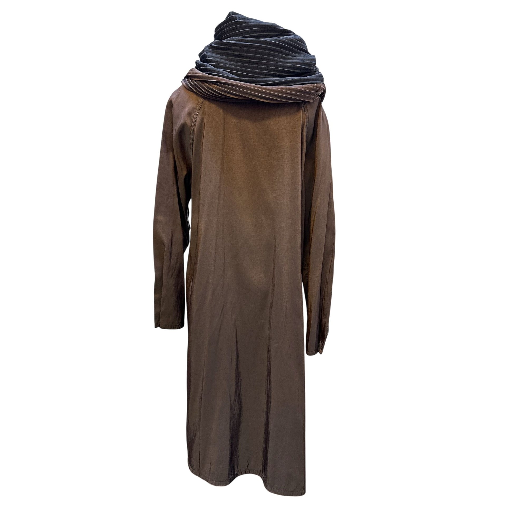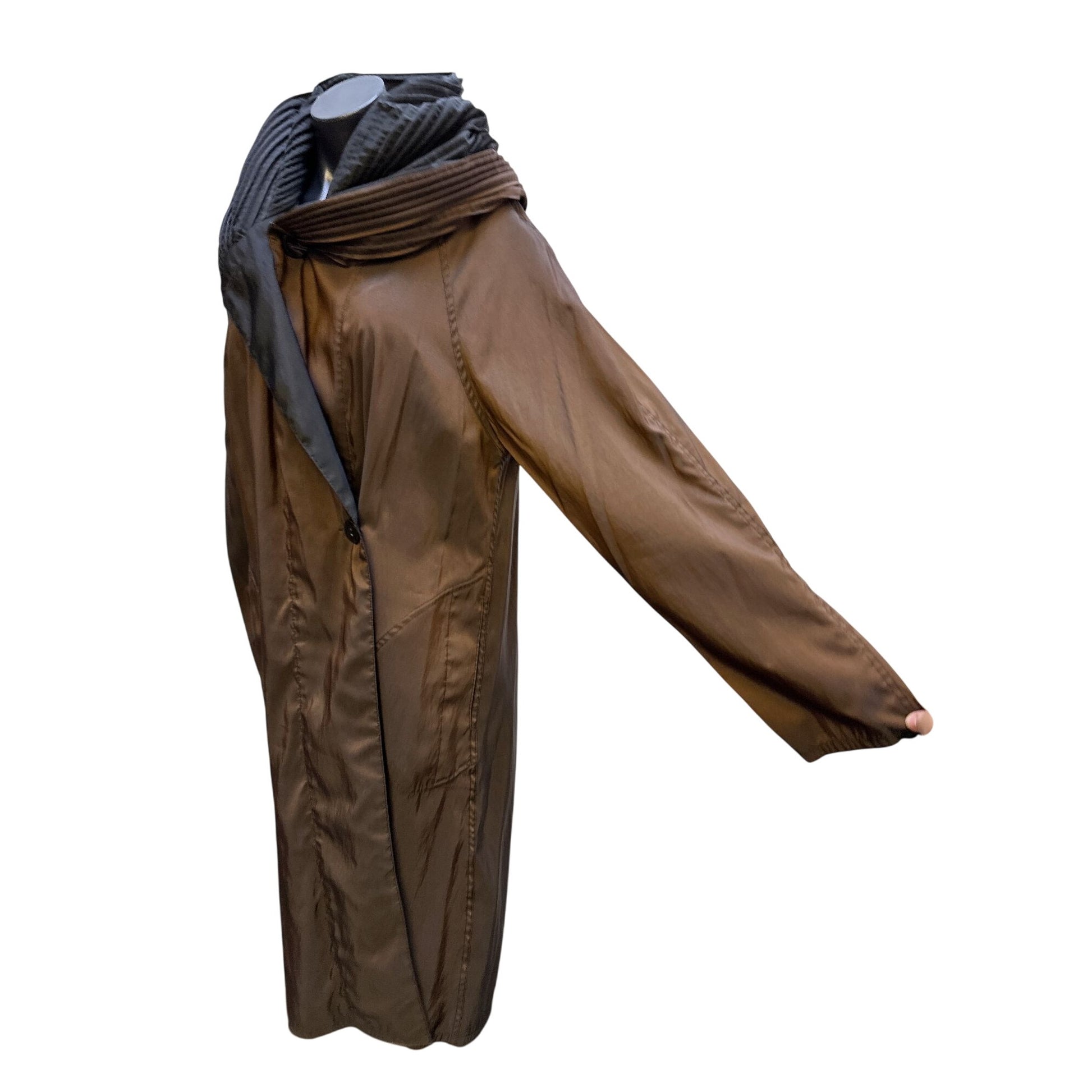 This asymmetrical brown/black reversible coat offers a stylish yet functional design. Featuring a pleated scarf collar, it is crafted from a polyester blend for durability. Has one missing top button but is not noticable nor affects the wear of the coat.