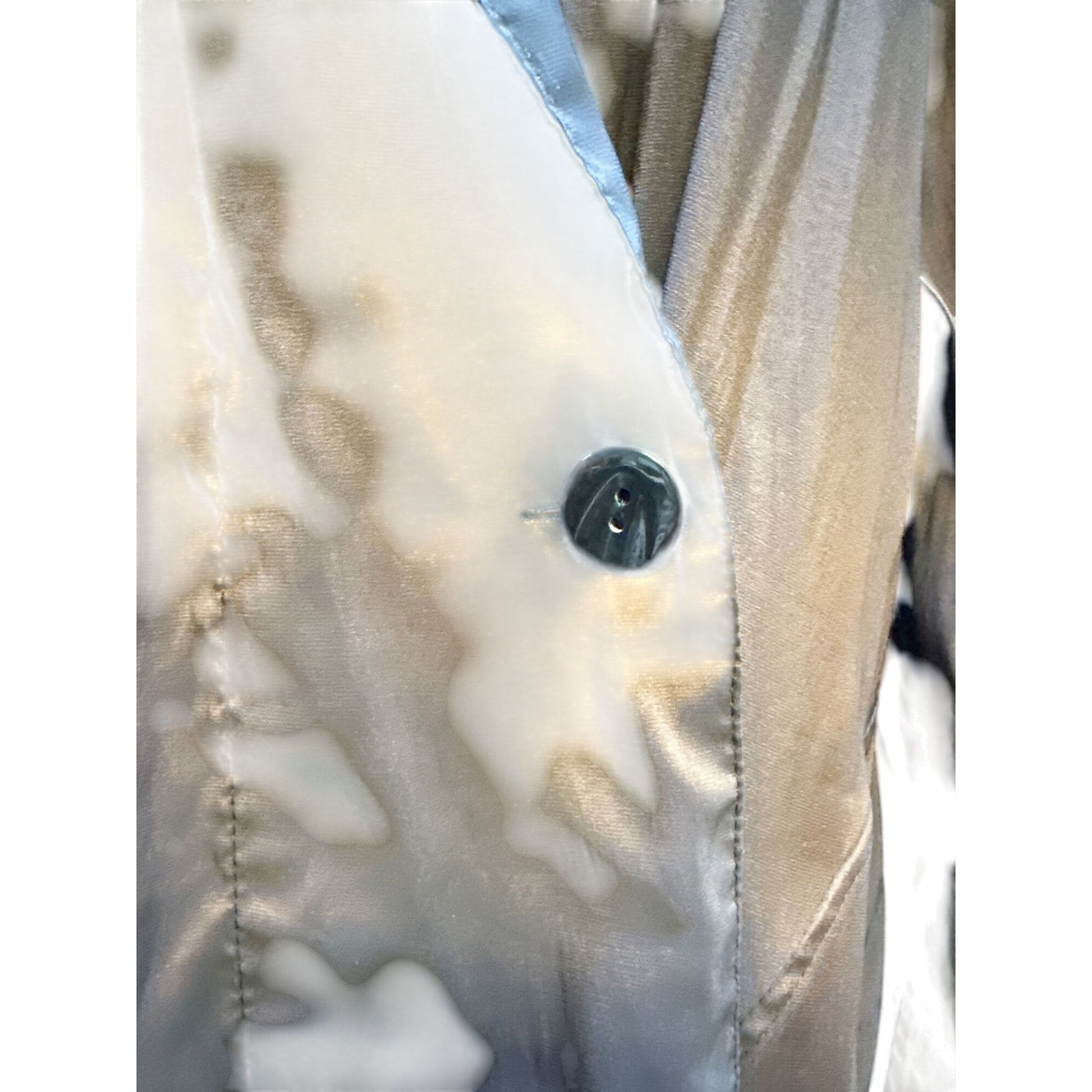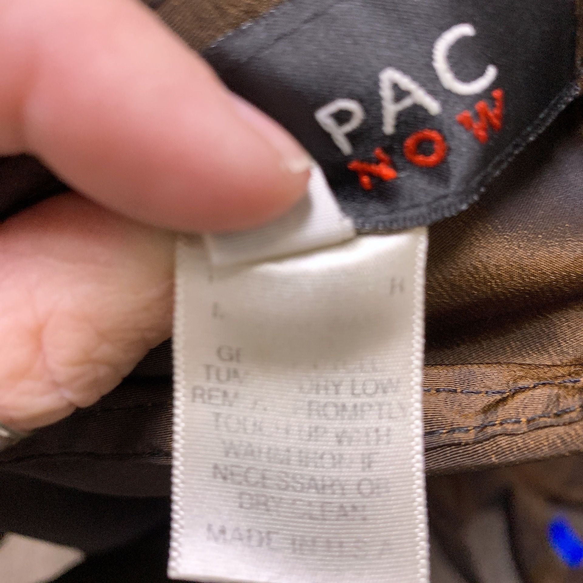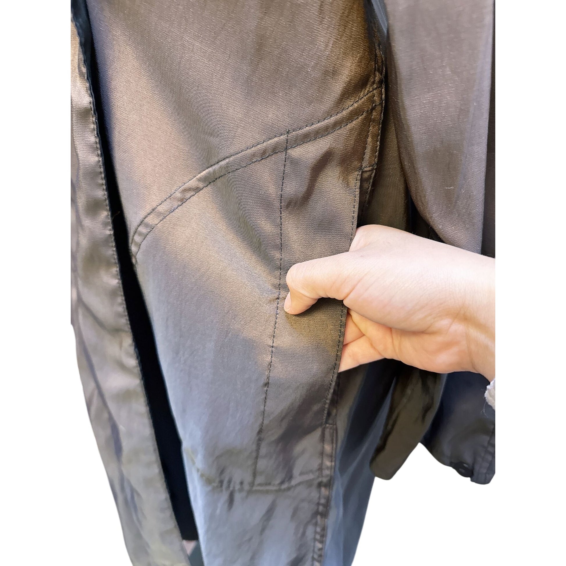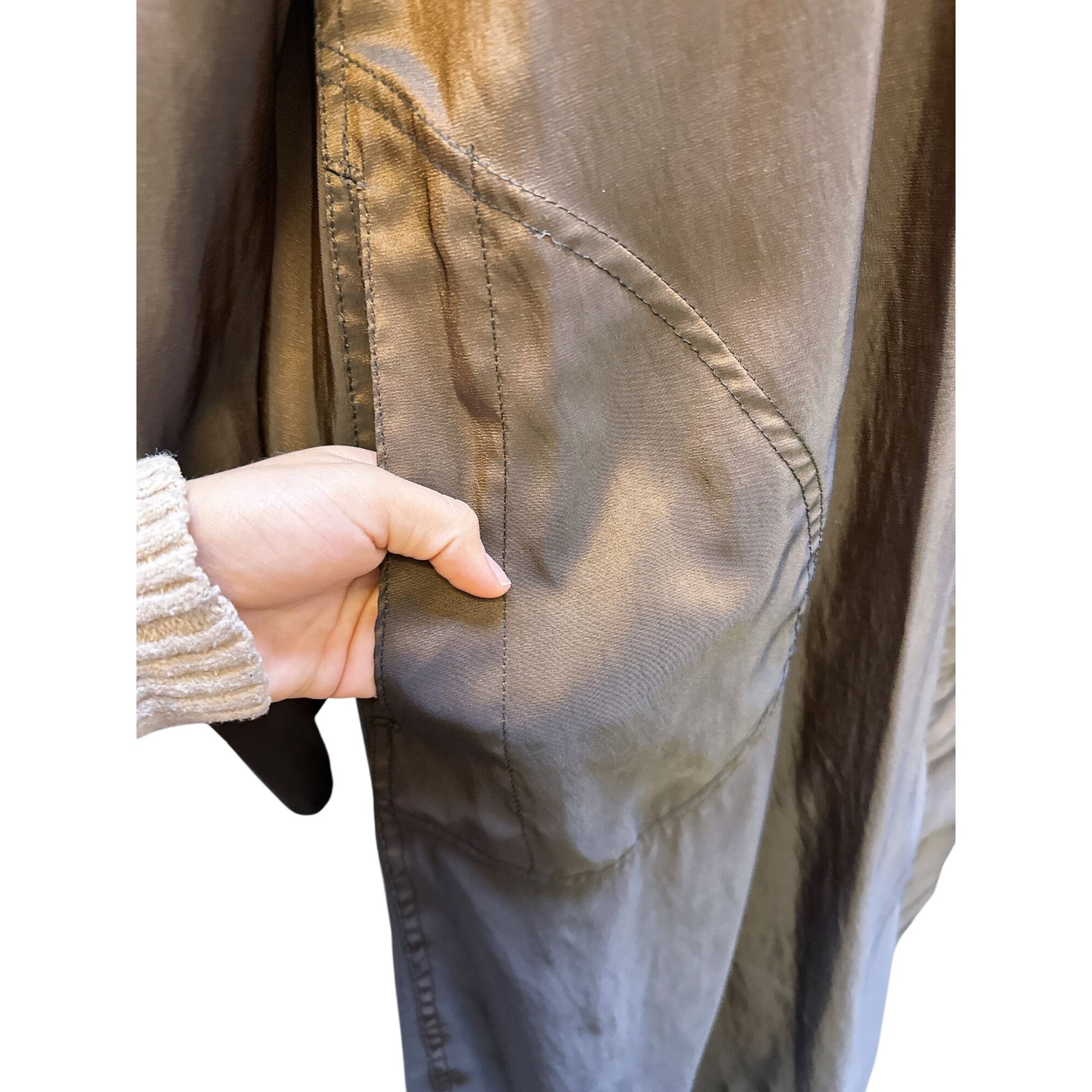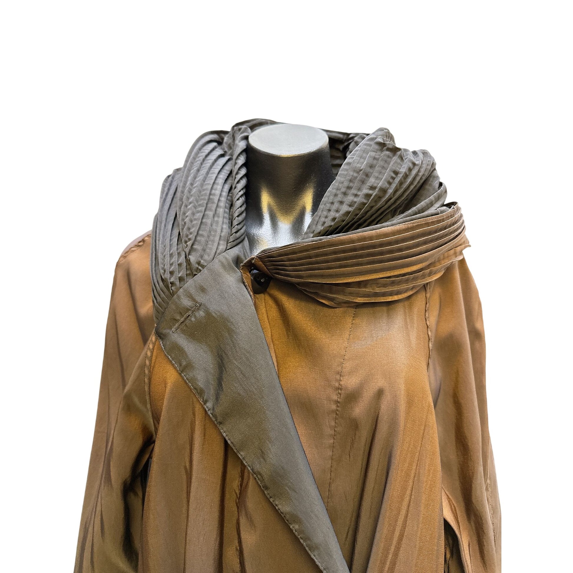 This asymmetrical brown/black reversible coat offers a stylish yet functional design. Featuring a pleated scarf collar, it is crafted from a polyester blend for durability. Has one missing top button but is not noticable nor affects the wear of the coat.