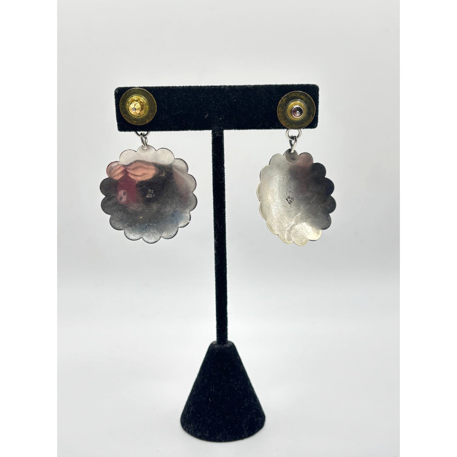 These exquisite handcrafted earrings showcase traditional Zuni stone inlay technique, featuring a vibrant mosaic heart design within a scalloped silver setting. Carefully arranged geometric stones in green, blue, red, orange, and purple create a striking color palette, representing the intricate artistry of Native American jewelry making.