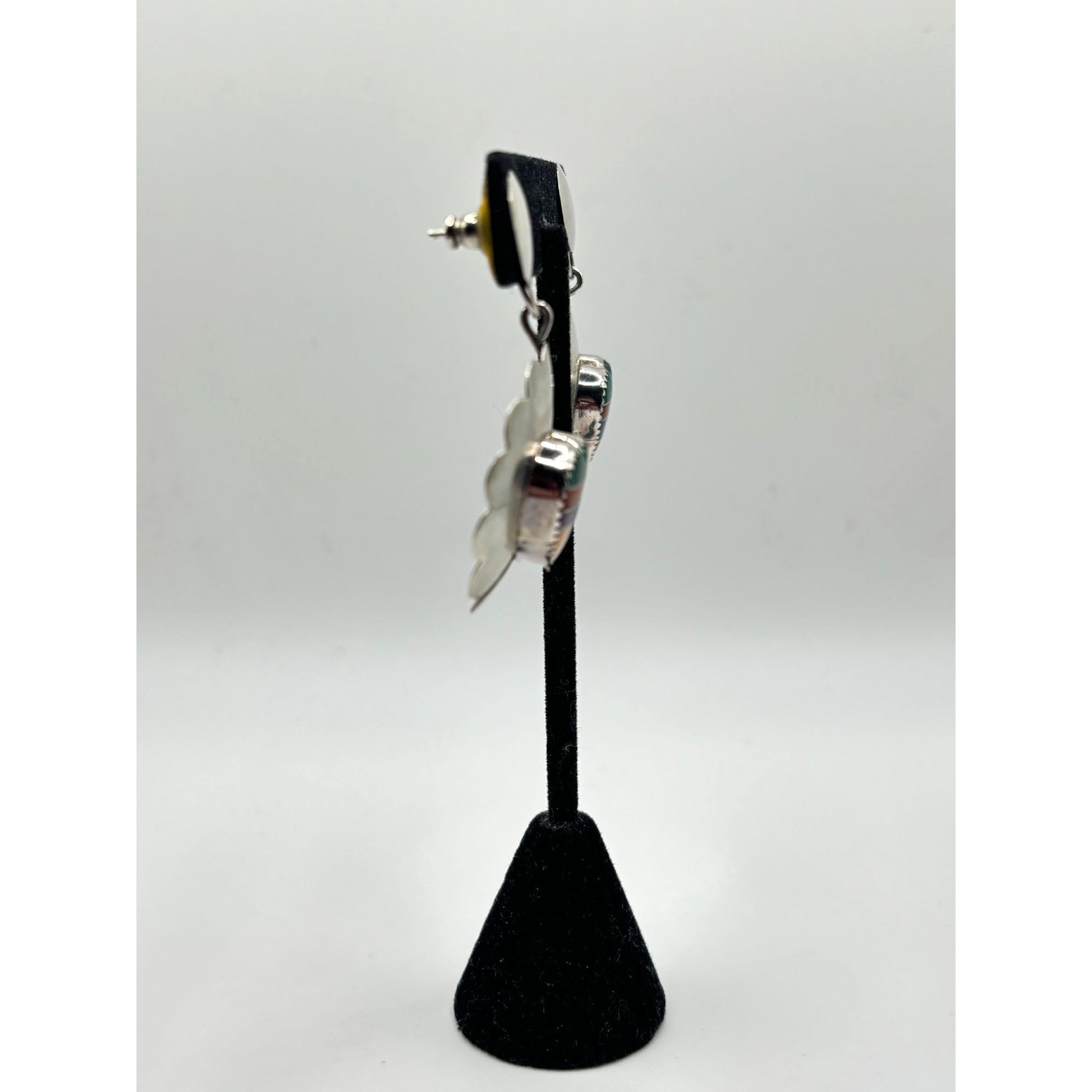 Native American Zuni Inlay Heart Dangle Earrings In Sterling Silver 925
