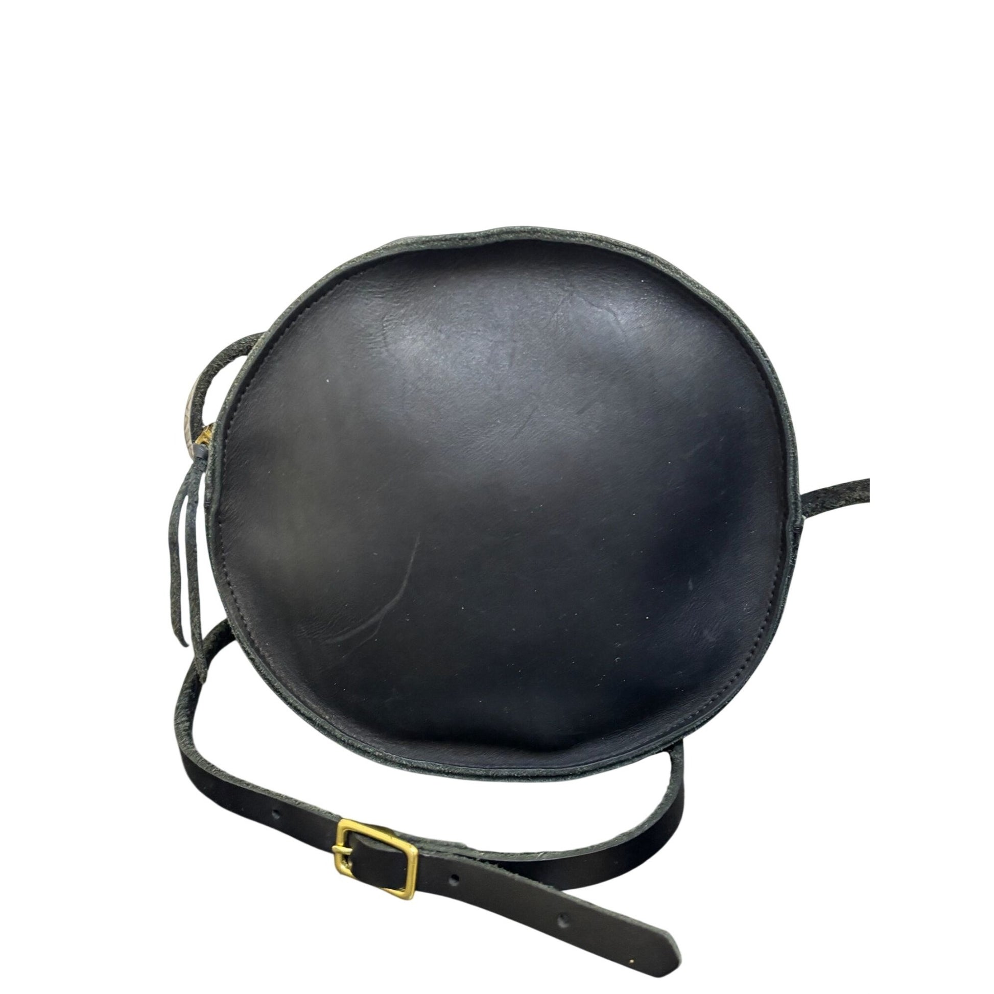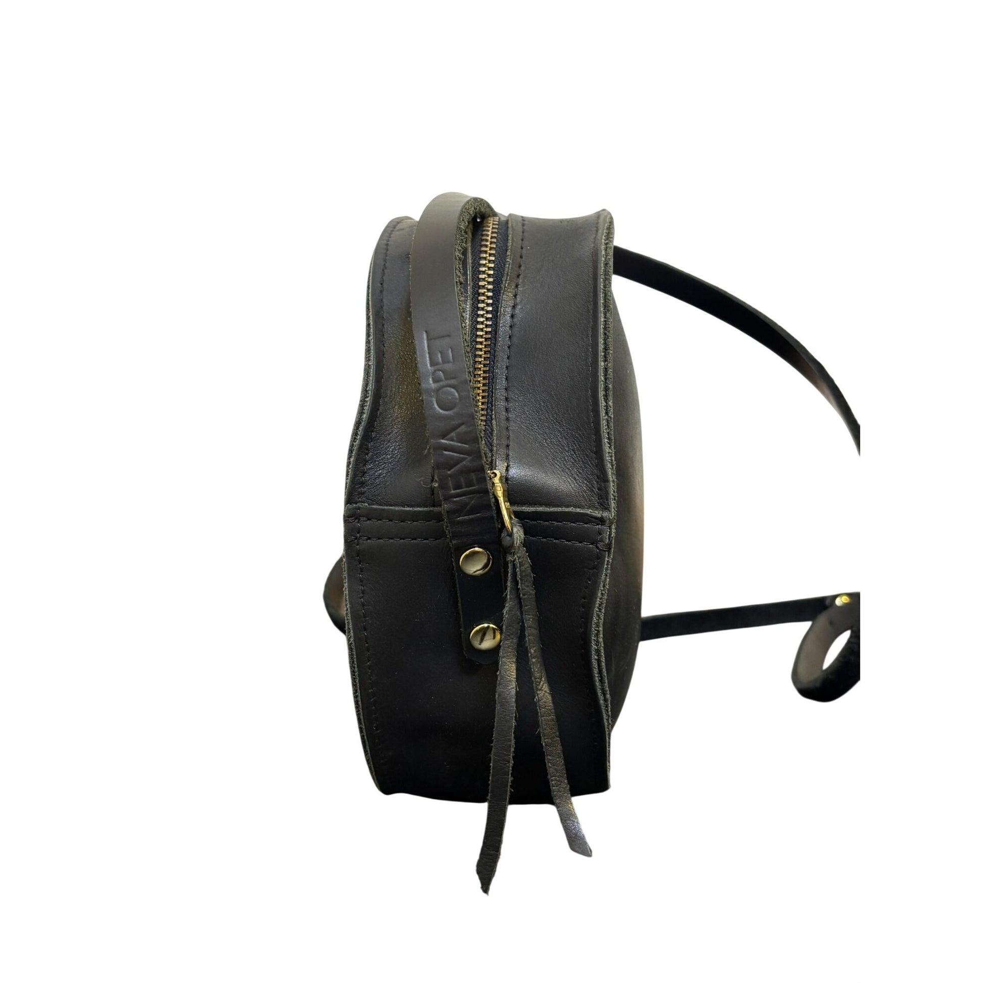 Neva Opet Round Leather Crossbody Bag Black Gold Hardware Zipper Closure
