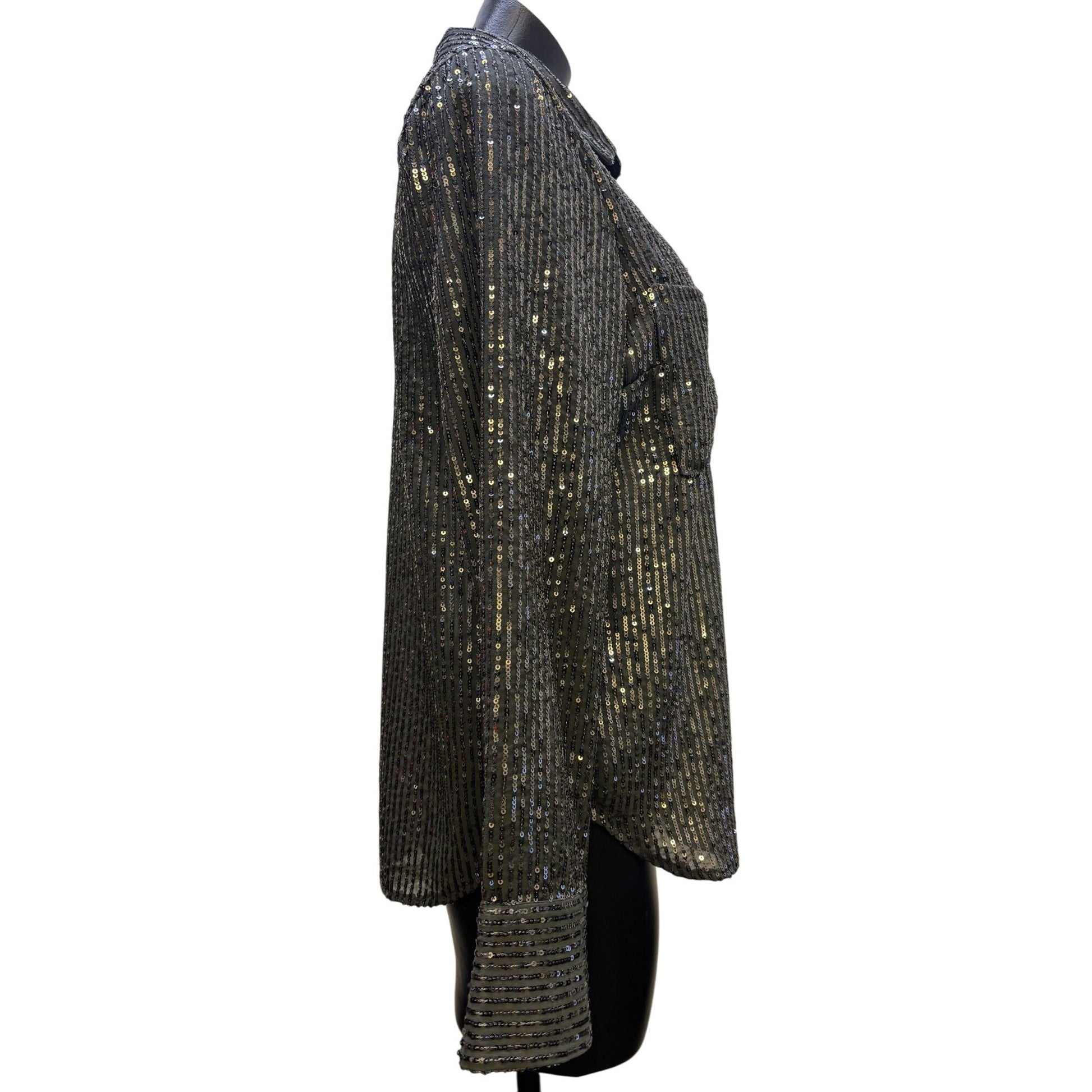 This blouse from Anthropologie adds a touch of glamour to any wardrobe with its shimmering sequins and versatile gray hue. Ideal for professional settings or evening events, it effortlessly combines style and sophistication.