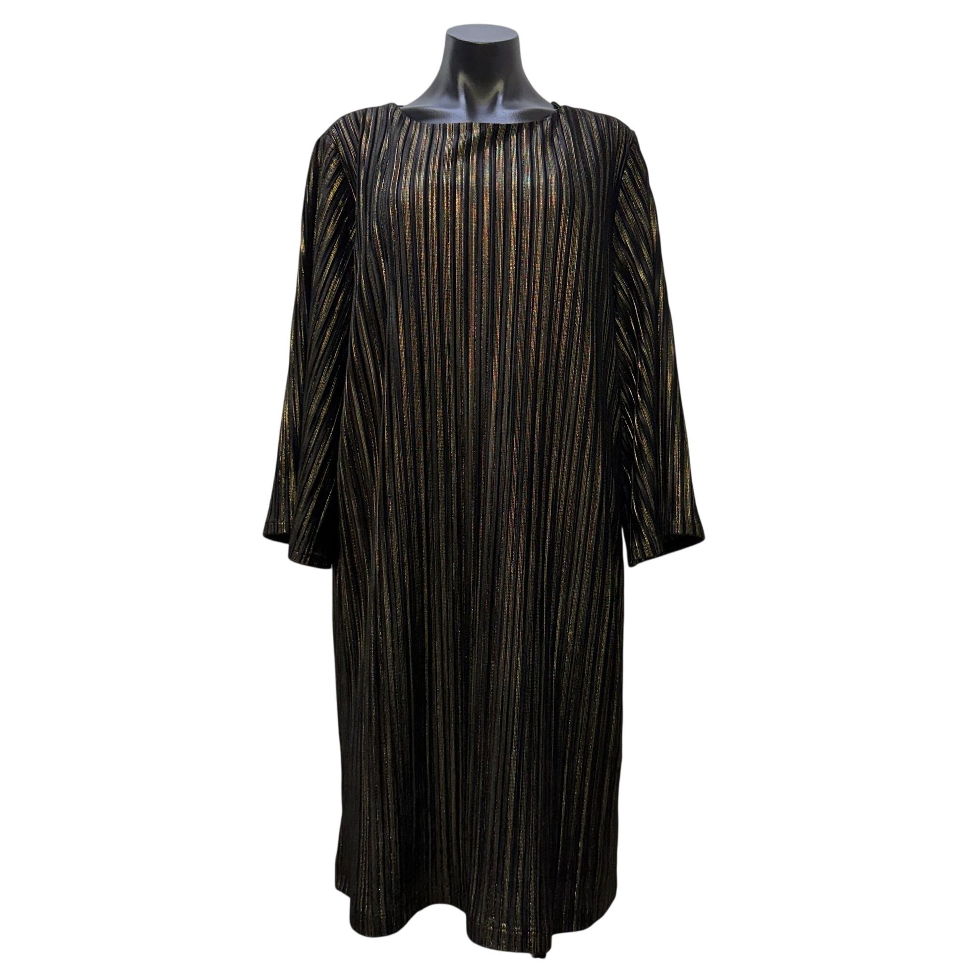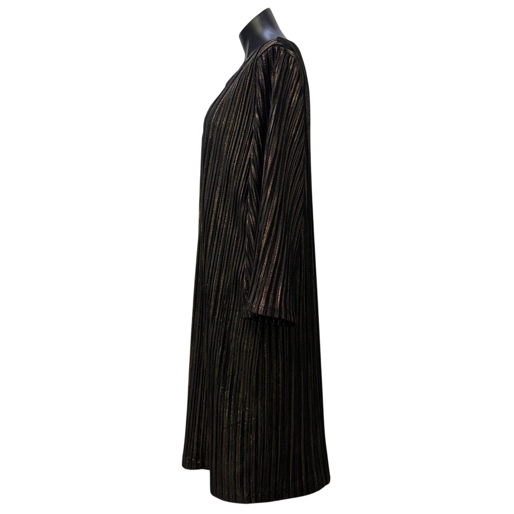 This chic black and gold dress features a lurex stripe velvet design. Its classic silhouette and premium fabric make it a refined wardrobe staple.
