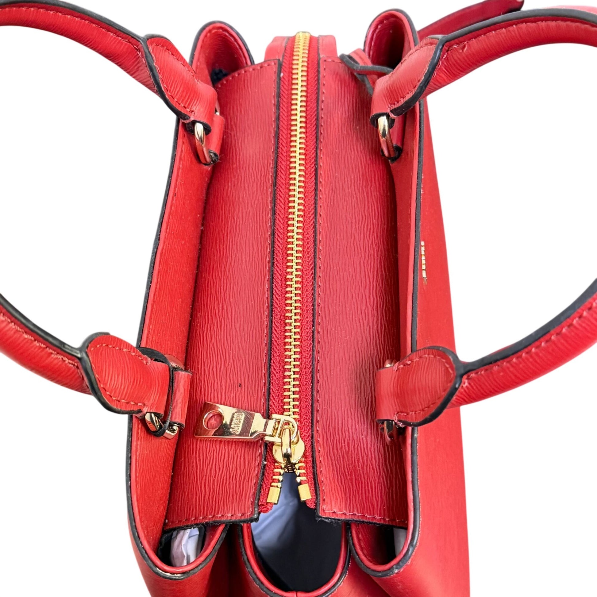 Crafted with precision, this DKNY handbag features a vivid red textured leather exterior, gold-tone hardware, and an elegant charm. Its functional design includes an adjustable strap, zippered back pocket, and spacious interior for organized storage.