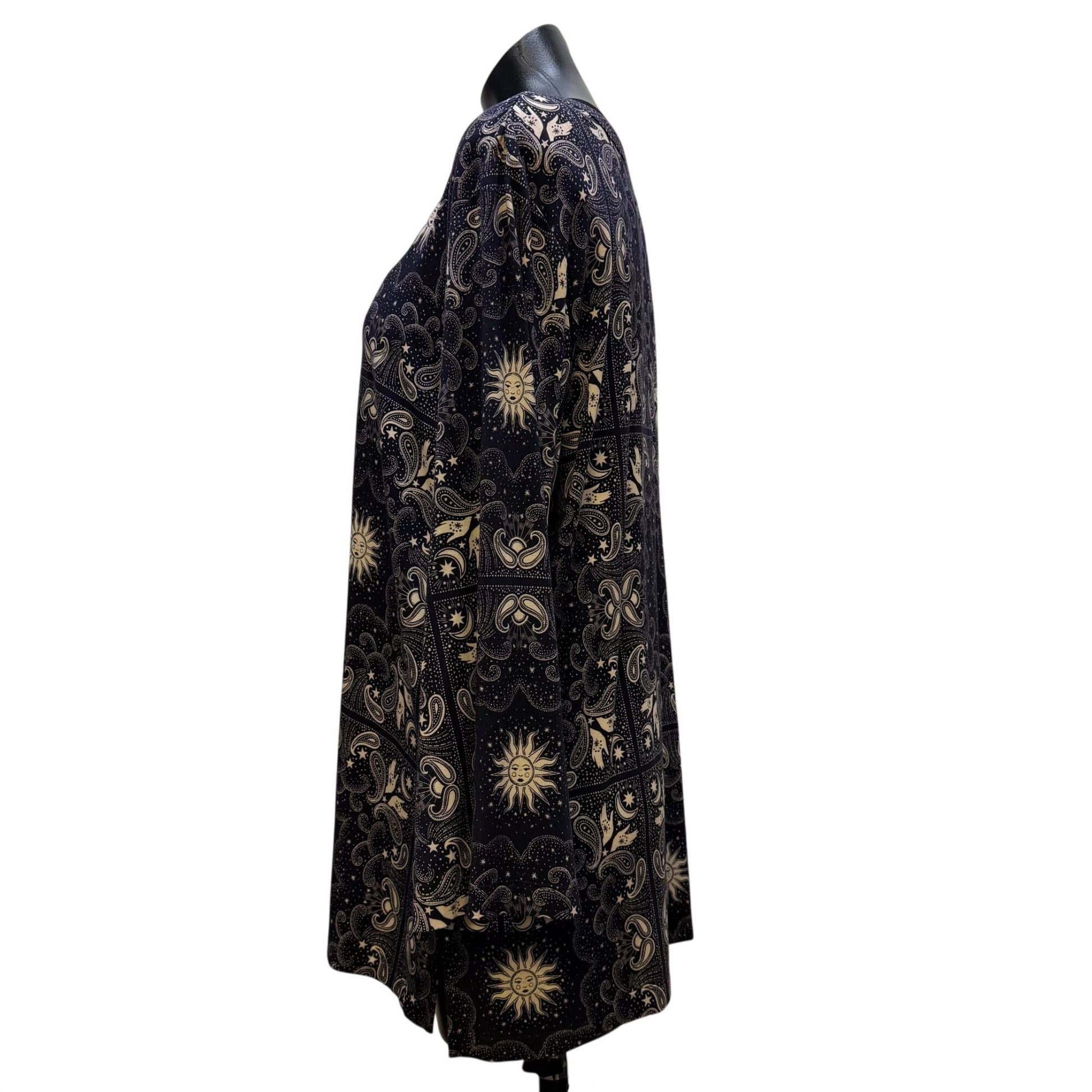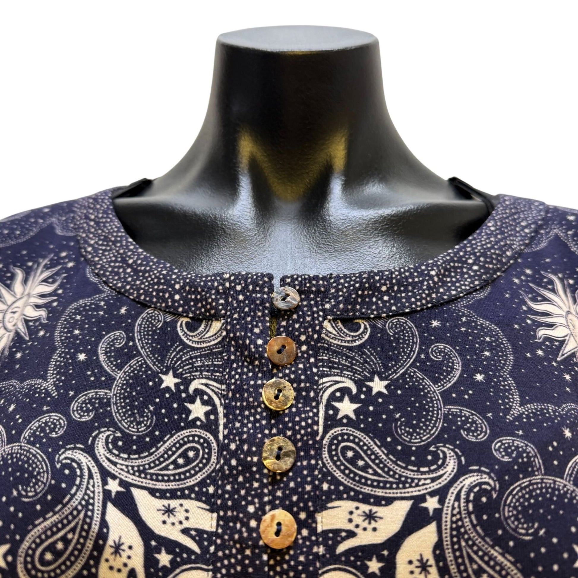 This blouse offers a refined and artistic touch with its intricate paisley and sun design on navy and cream fabric. Its breathable rayon material and button-front detail provide both comfort and elegance for professional or casual settings.