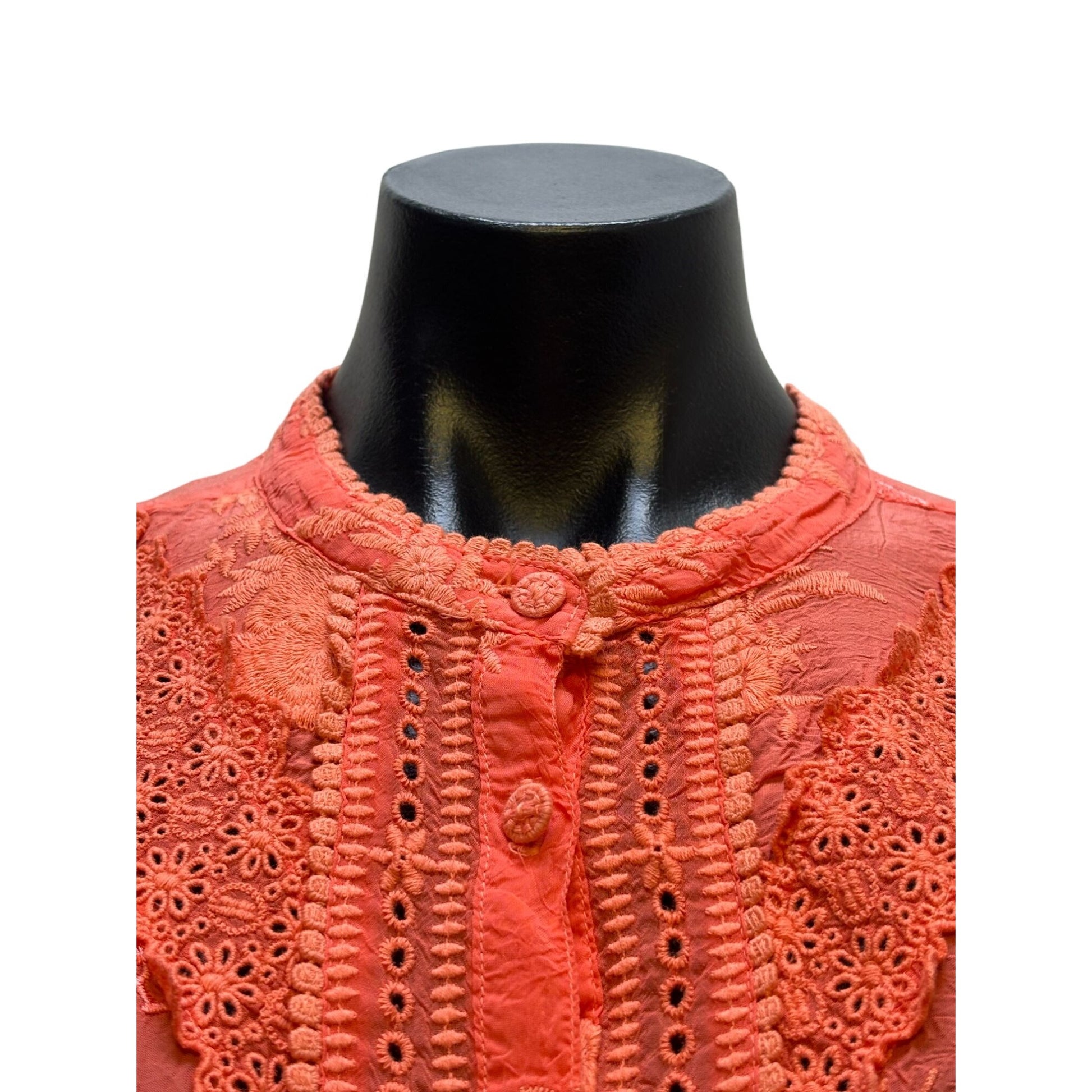 This intricately embroidered silk blouse from Johnny Was offers a sophisticated, lightweight design. Its vibrant orange hue and delicate detailing enhance elegance.