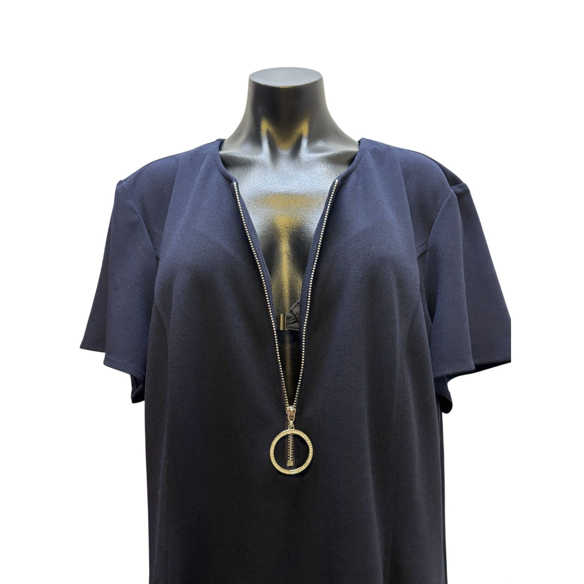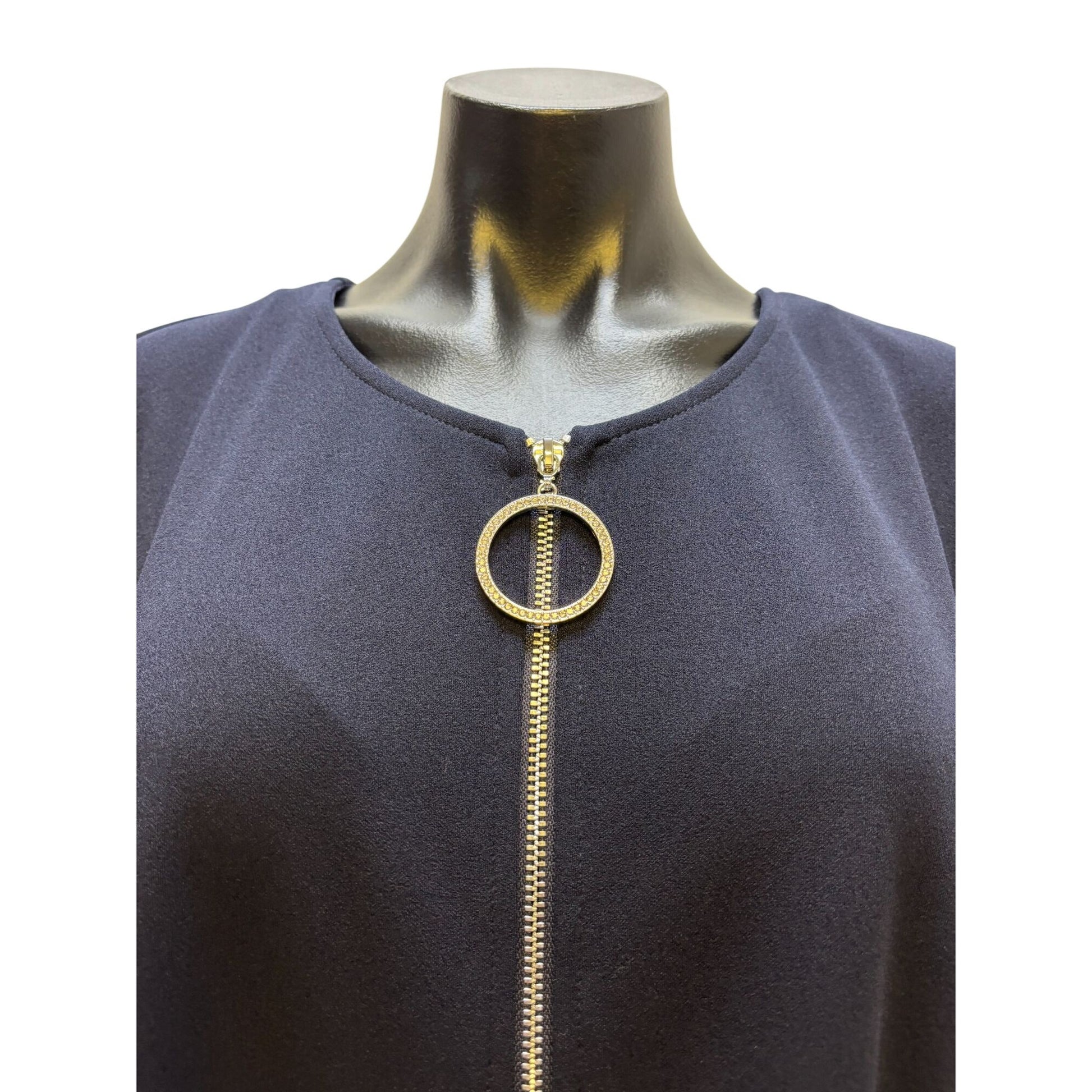 This A-line dress offers a sophisticated silhouette with short sleeves and a gold circle zipper detail. Designed for versatile, polished wear.