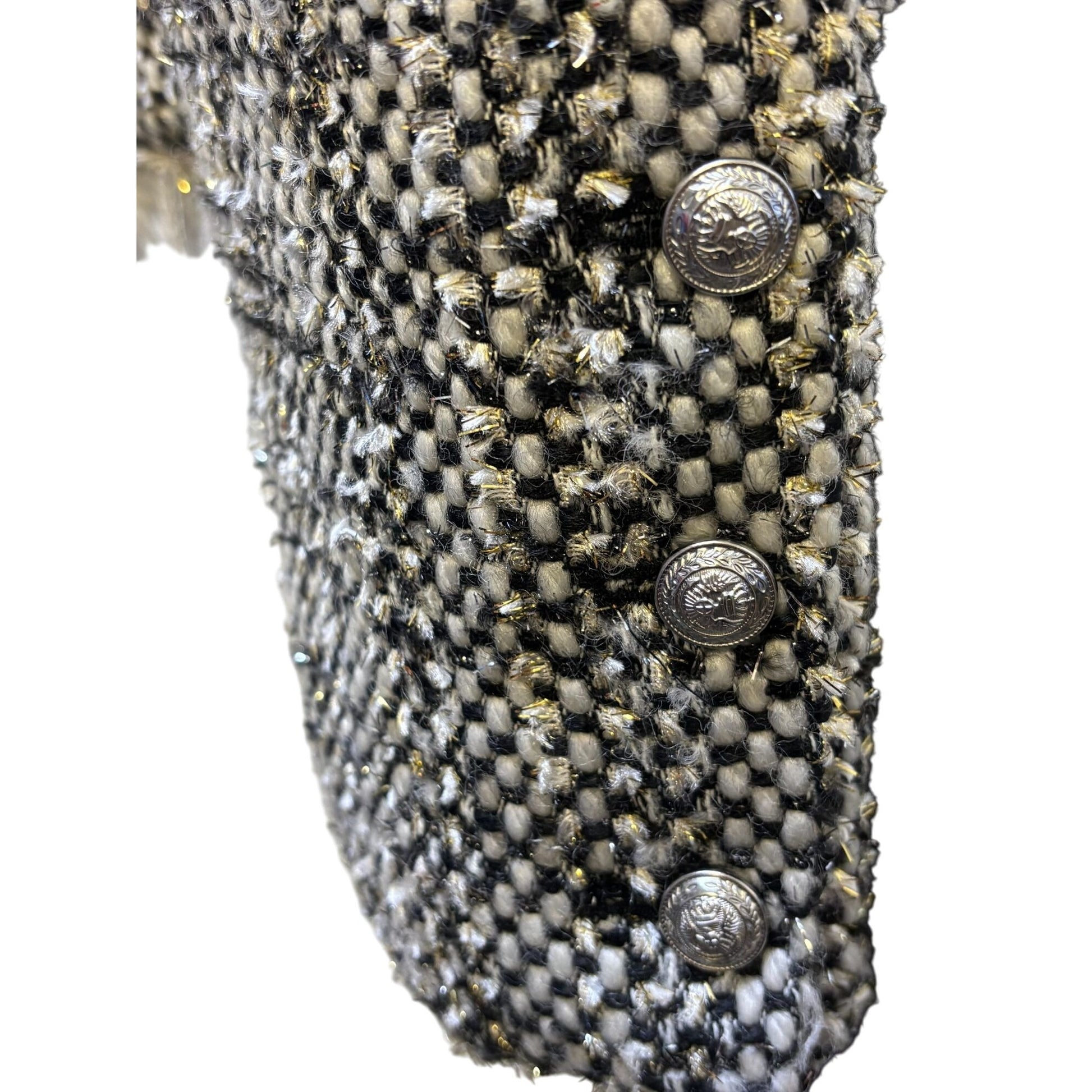 This L'agence tweed jacket offers a sophisticated style with its textured knit and elegant fringe detailing. Ideal for business meetings and formal gatherings, it combines a classic black and white palette with exquisite craftsmanship. The quality materials ensure durability and a comfortable fit for the discerning dresser.