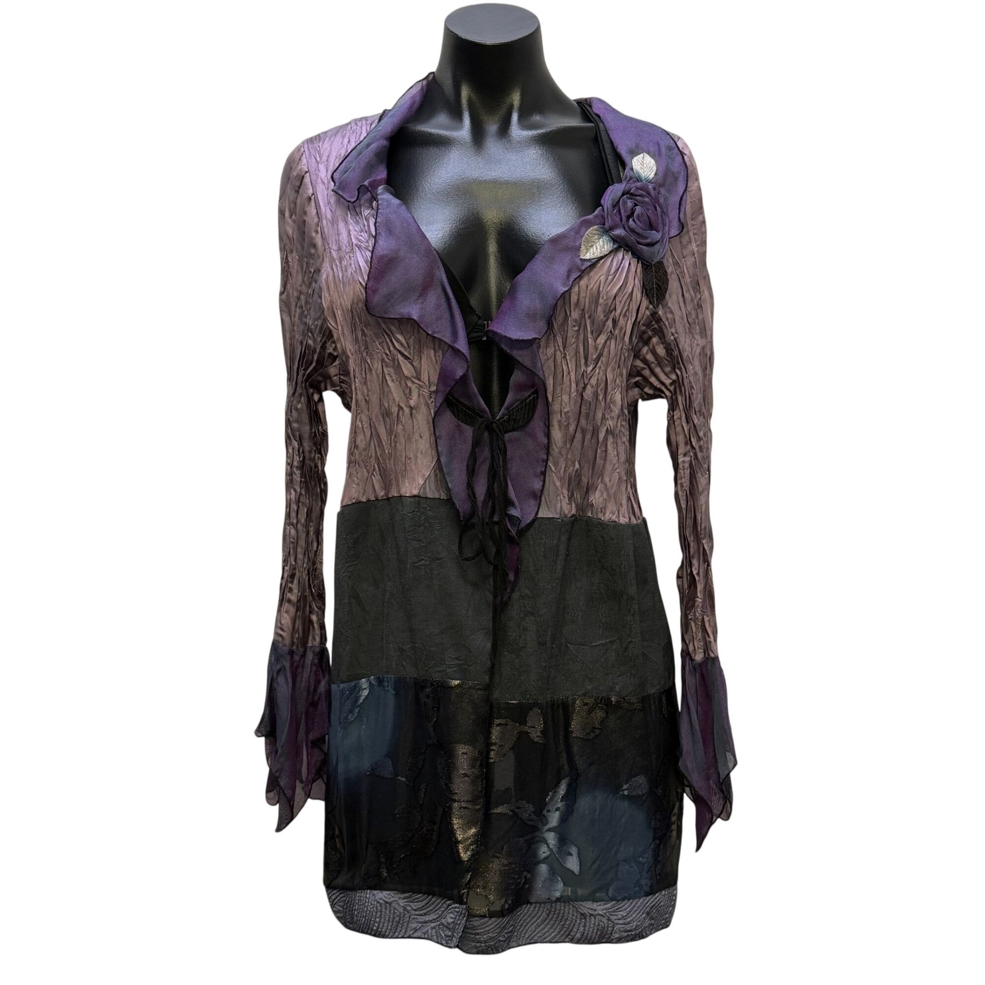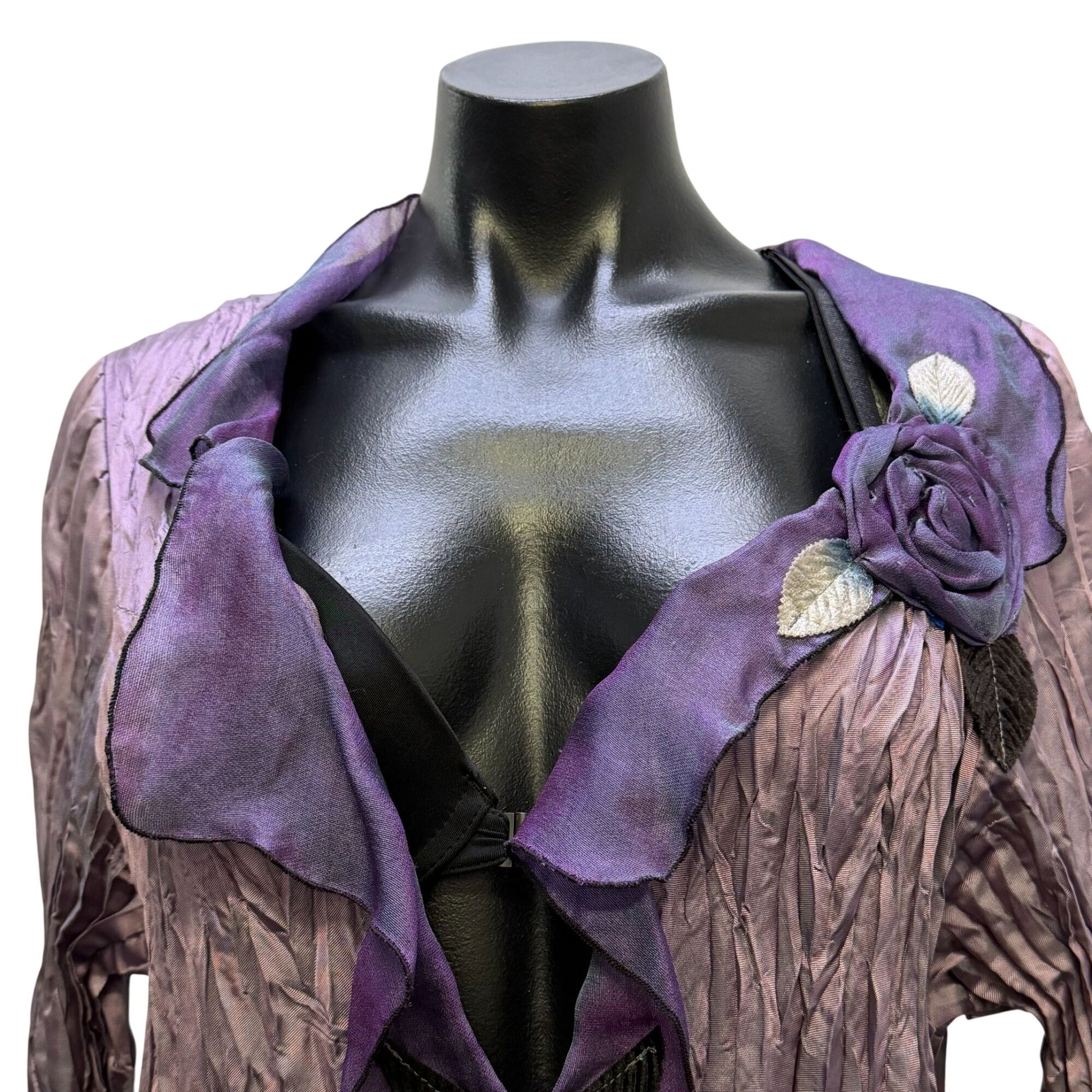NWT Lee Anderson Purple & Blue Crinkle Long-Sleeve Cardigan Floral Trim L