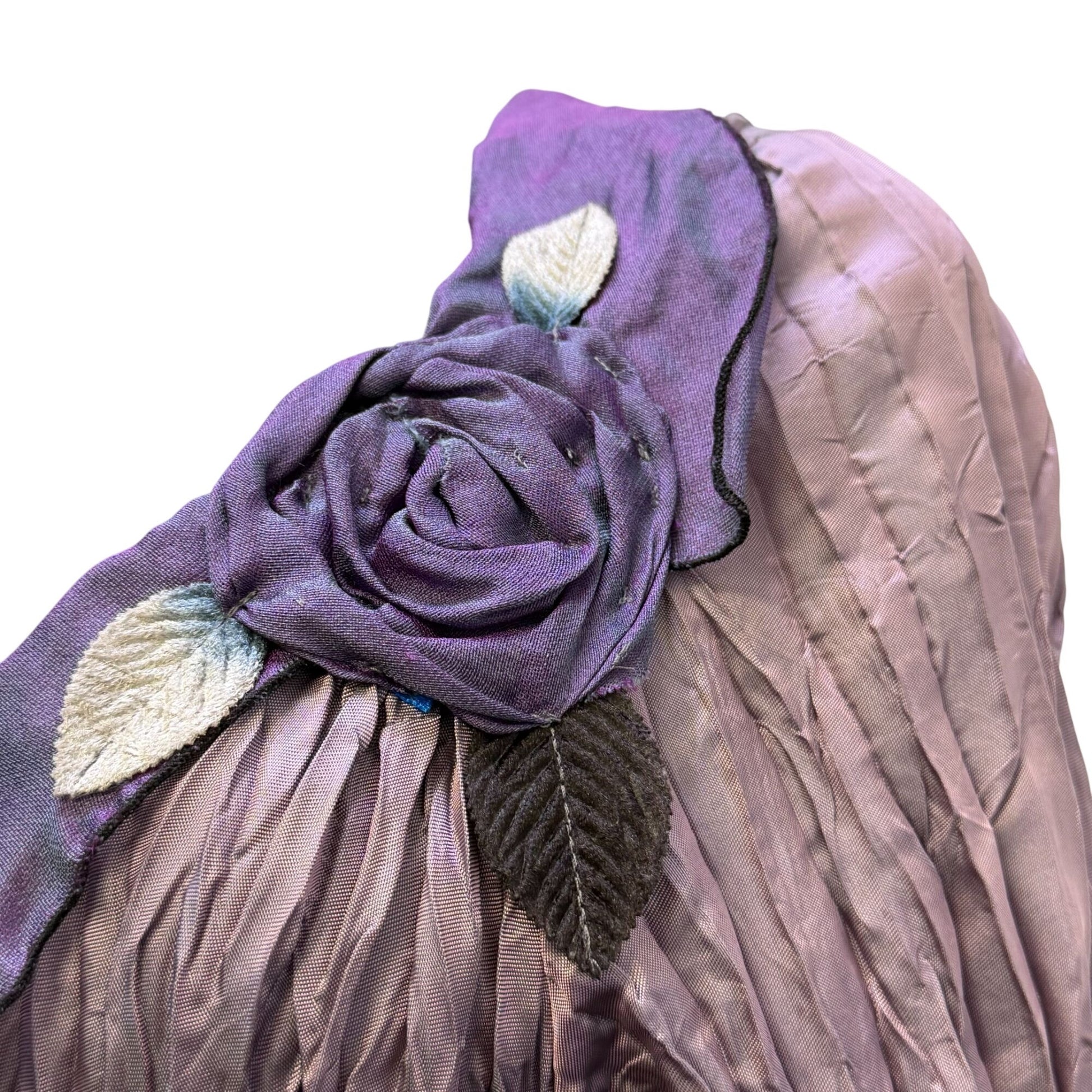 This cardigan combines a crinkled texture with a tiered design, featuring floral appliqué and sheer accents. Ideal for adding artistic flair to outfits.