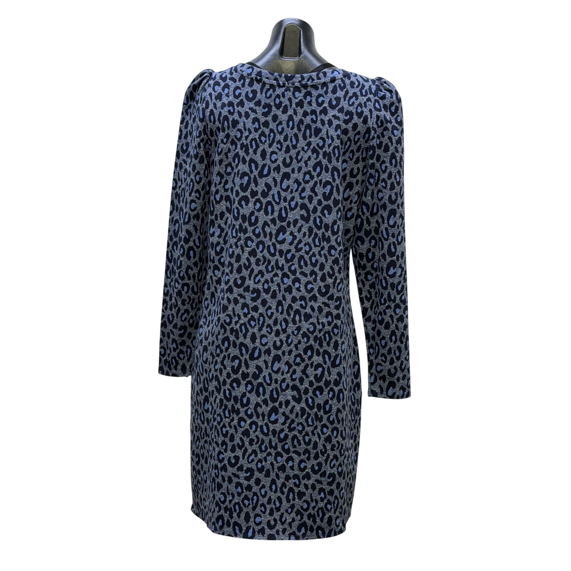 This Talbots knit dress combines comfort and sophistication, featuring a bold blue leopard pattern and long sleeves. Designed for versatility and style.