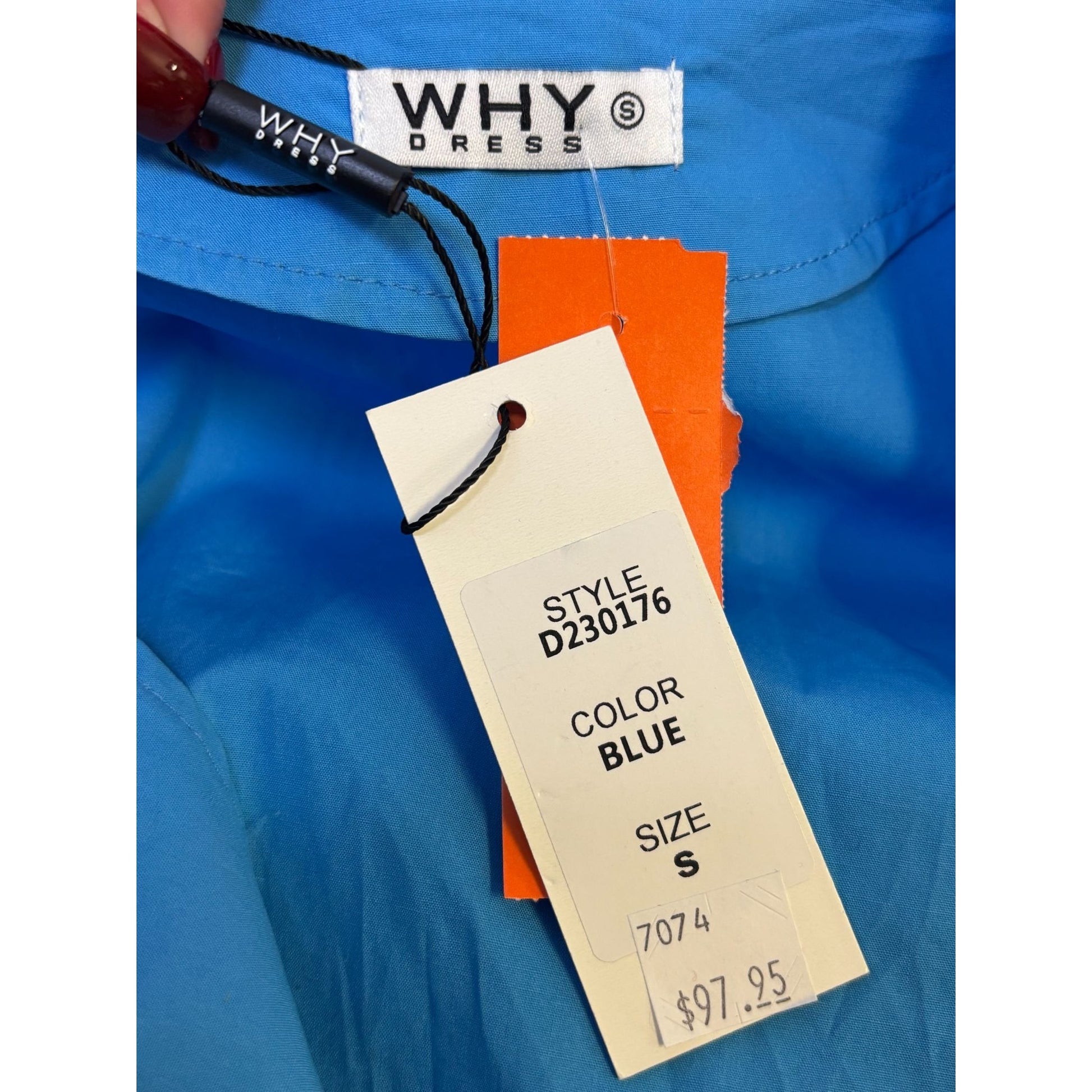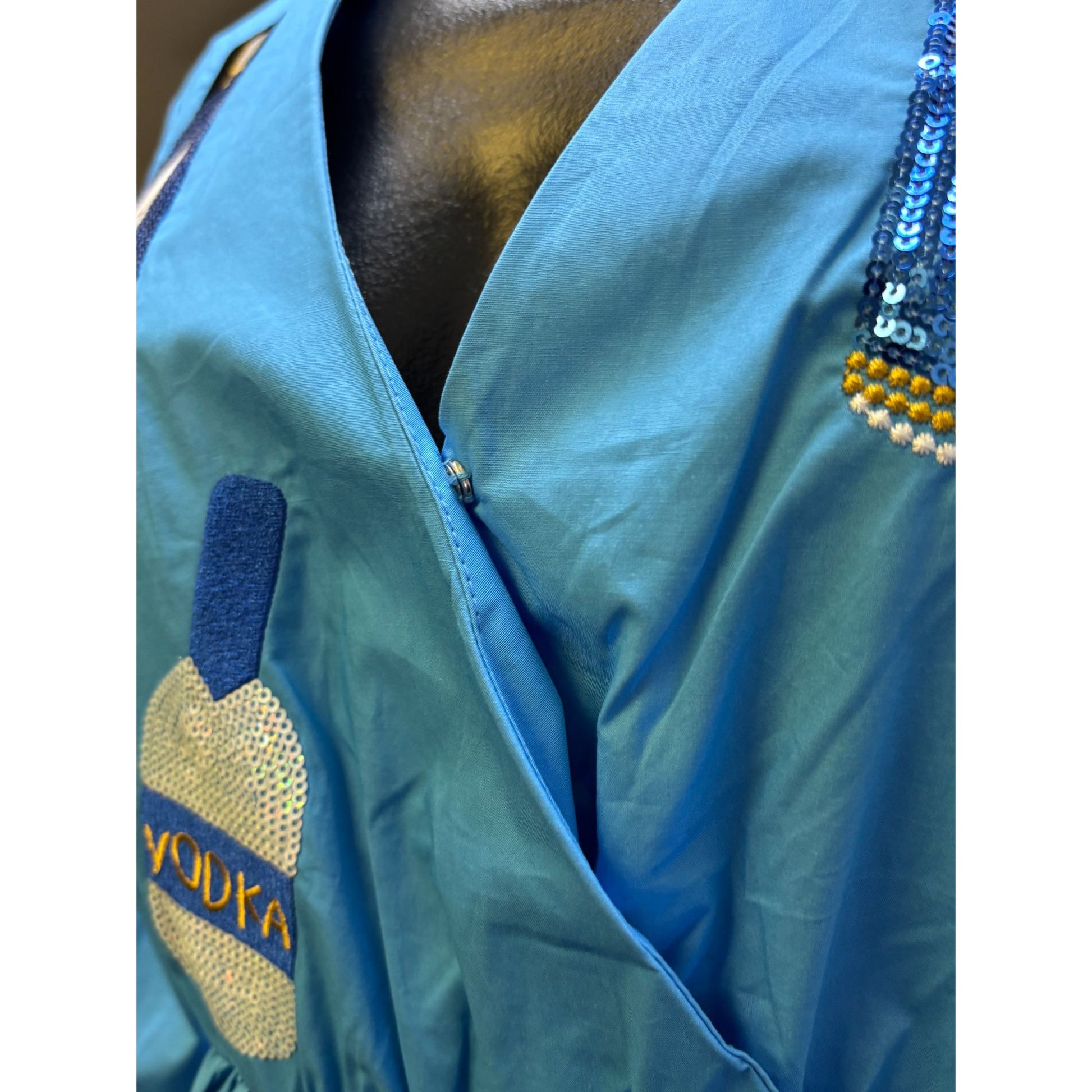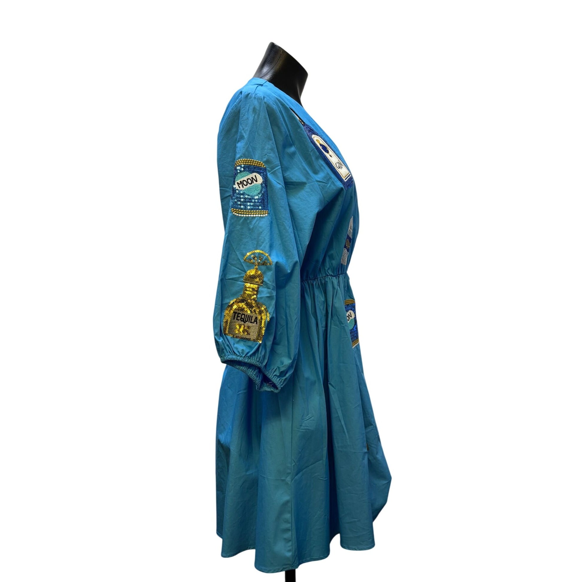 NWT Why Blue Sequin Patch Dress With Vodka & Gin Bottle Motifs S