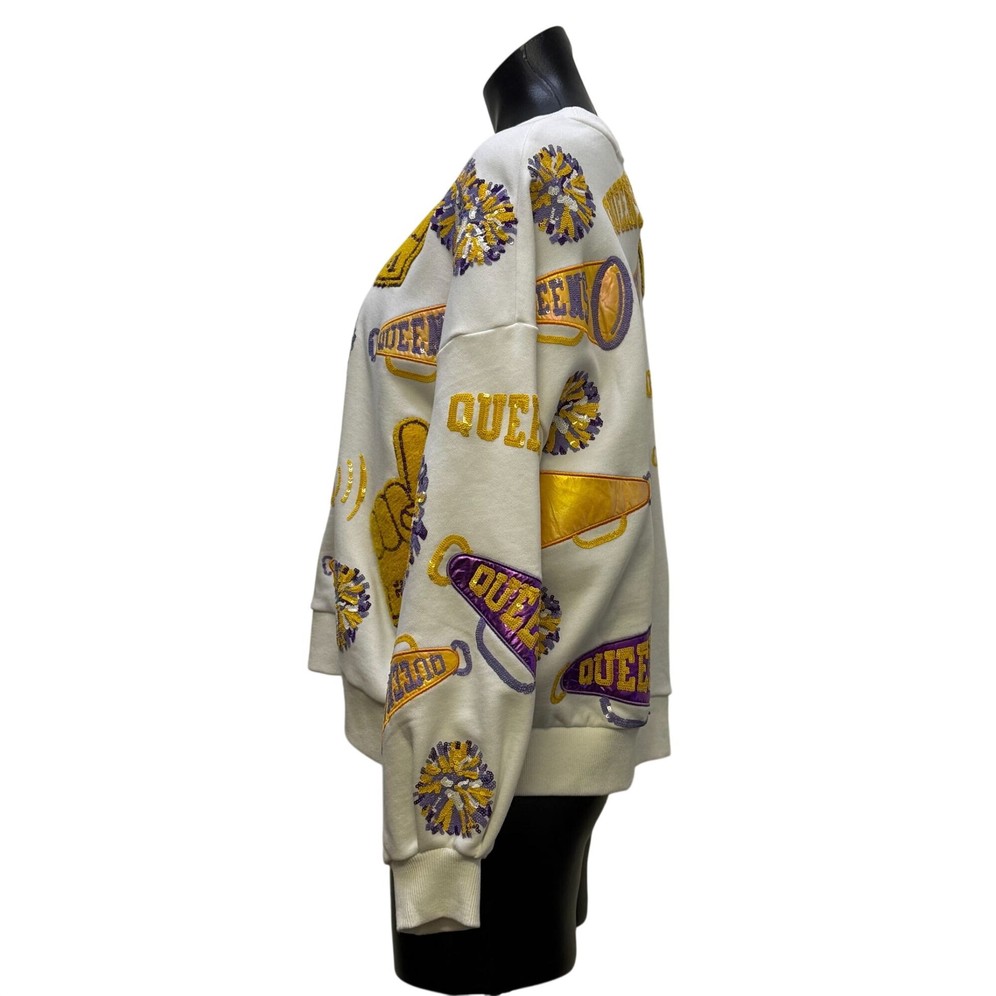 This cheer-themed sweater features vibrant yellow and purple sequins with embroidery on a white cotton-blend fabric. A bold, playful statement piece.