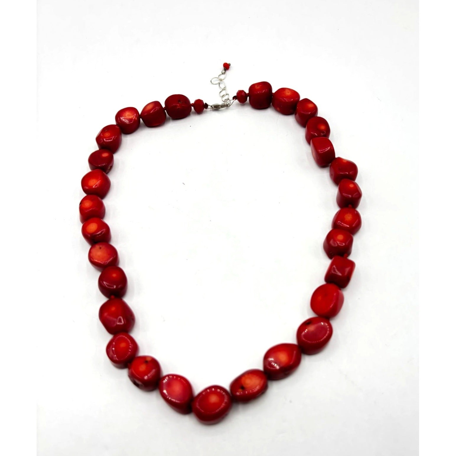 This vibrant red coral beaded necklace features a secure silver clasp and an extender for adjustable length. Its rich color and polished finish make it a striking addition to any jewelry collection.