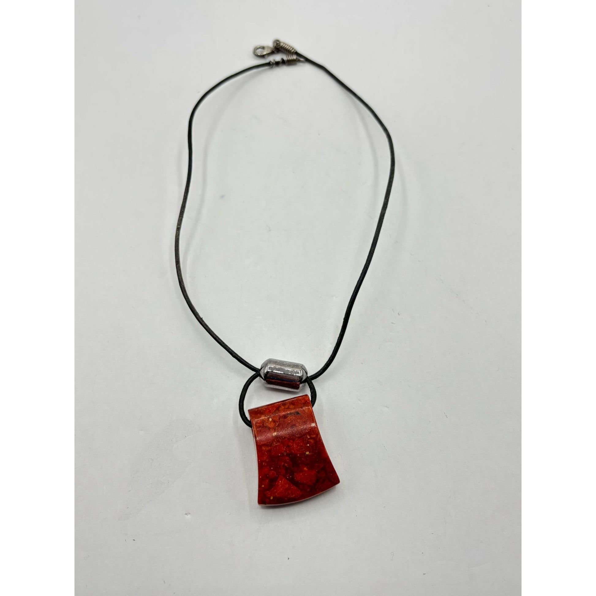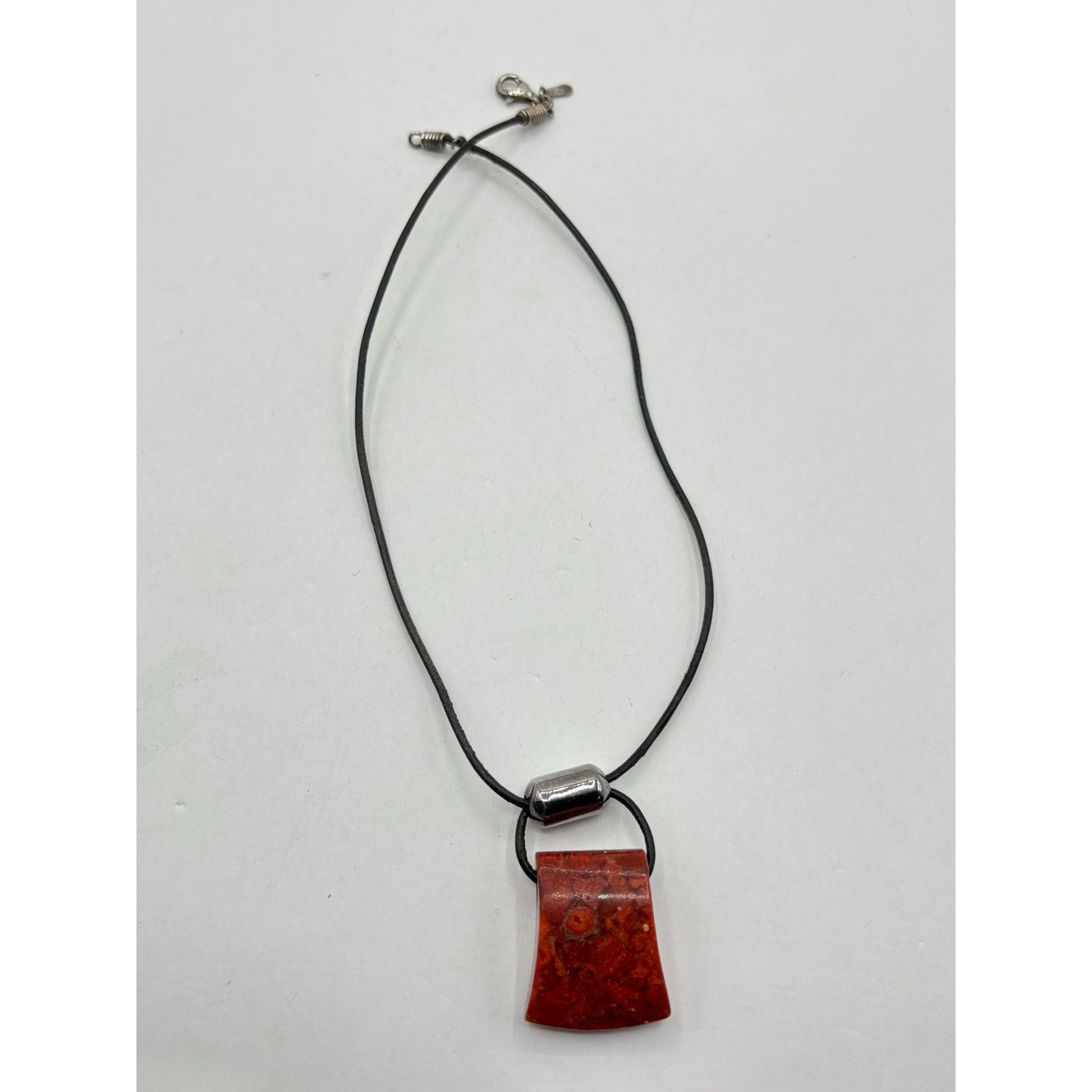 This Silpada necklace elegantly combines a sterling silver clasp and a vibrant coral pendant, presenting a sophisticated accessory for jewelry enthusiasts. The pendant's unique shape complemented by a simple black cord adds a modern touch, making it suitable for professional attire or casual ensembles.