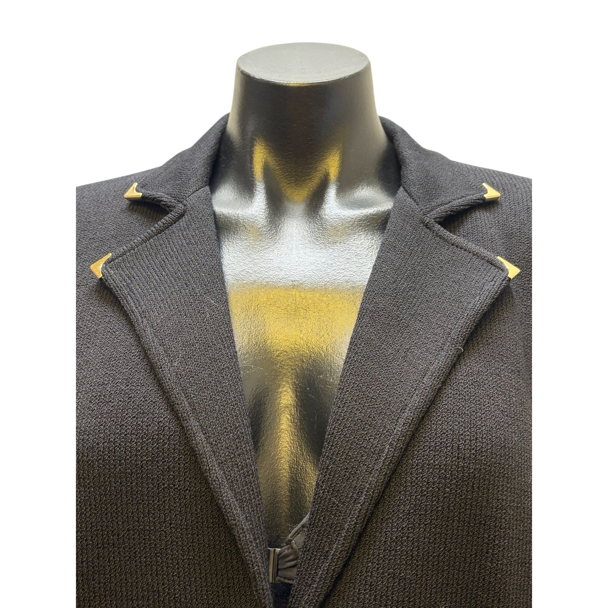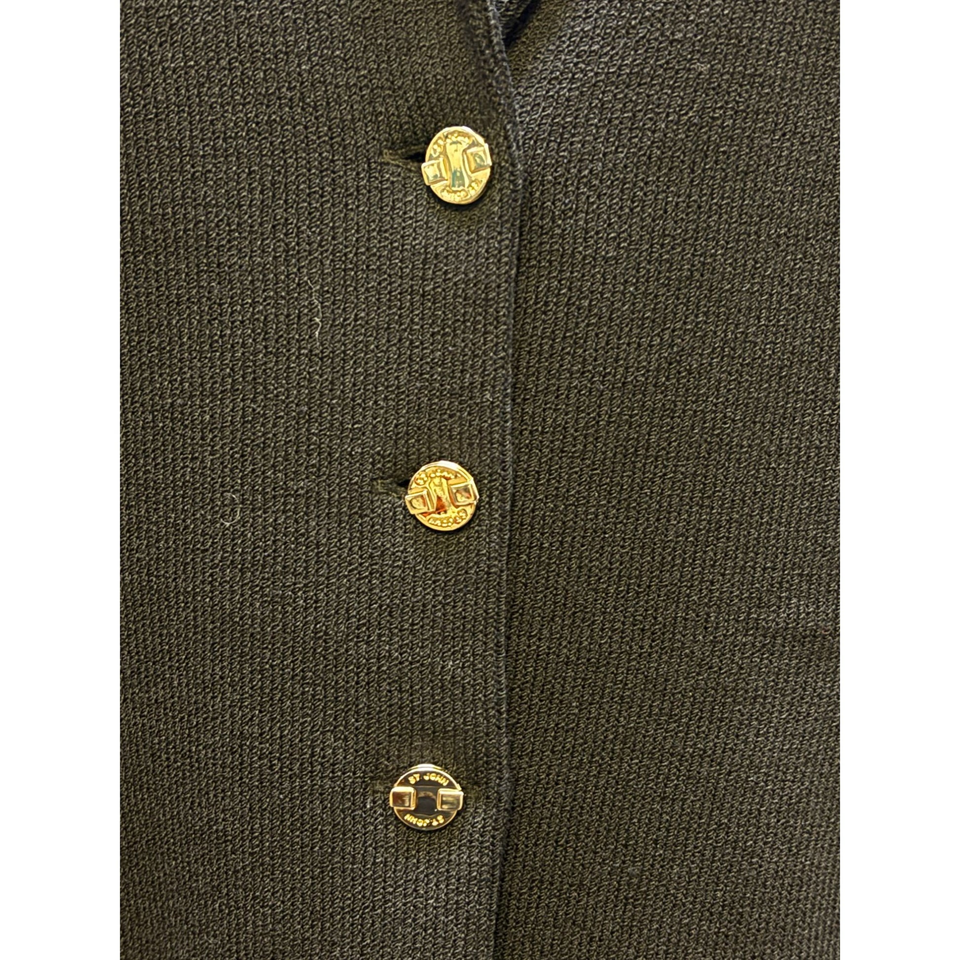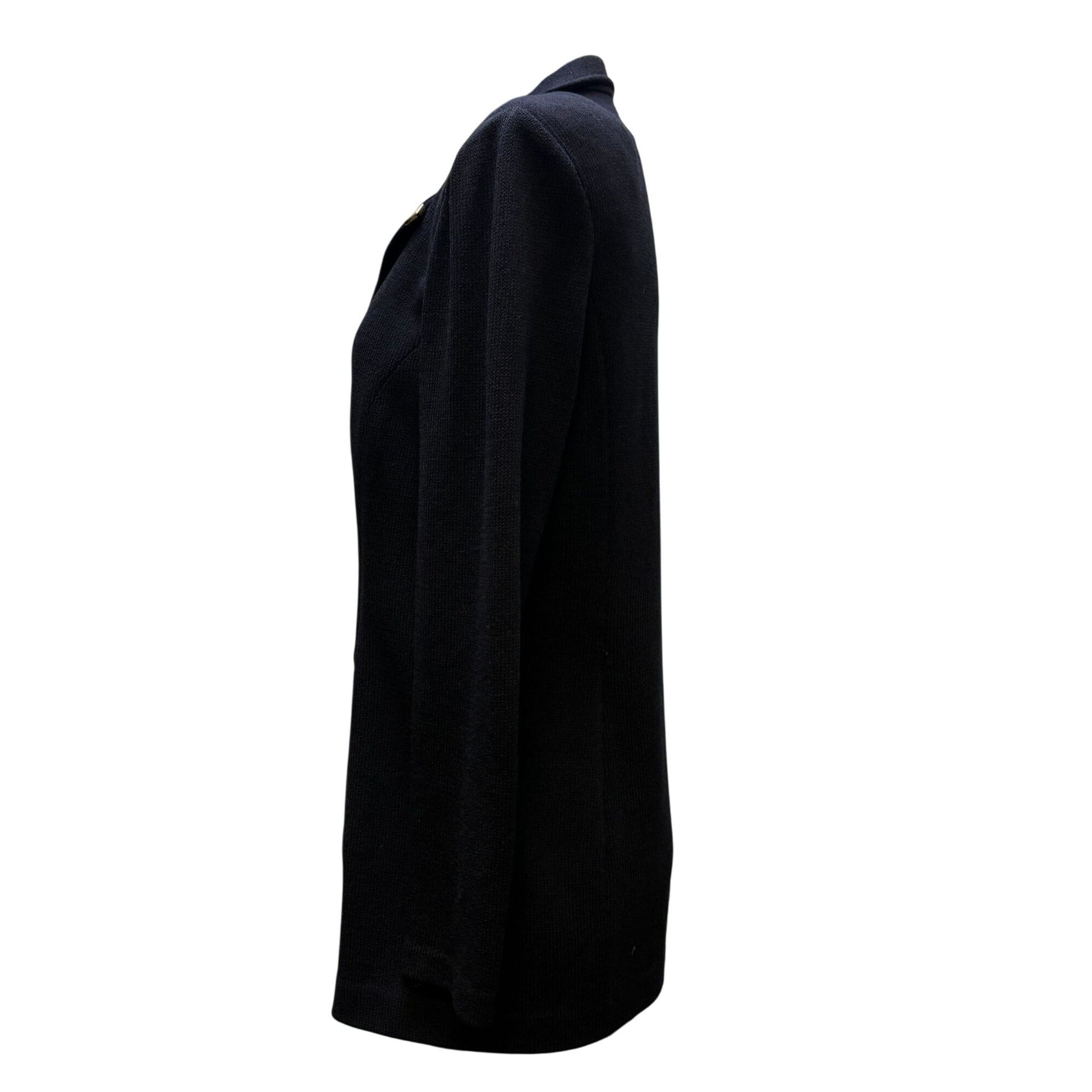 This sophisticated St. John Knit suit set features a black jacket and matching pants, designed for a polished and professional appearance. The jacket's gold button accents and tailored fit exemplify elegance and style, ideal for business settings.