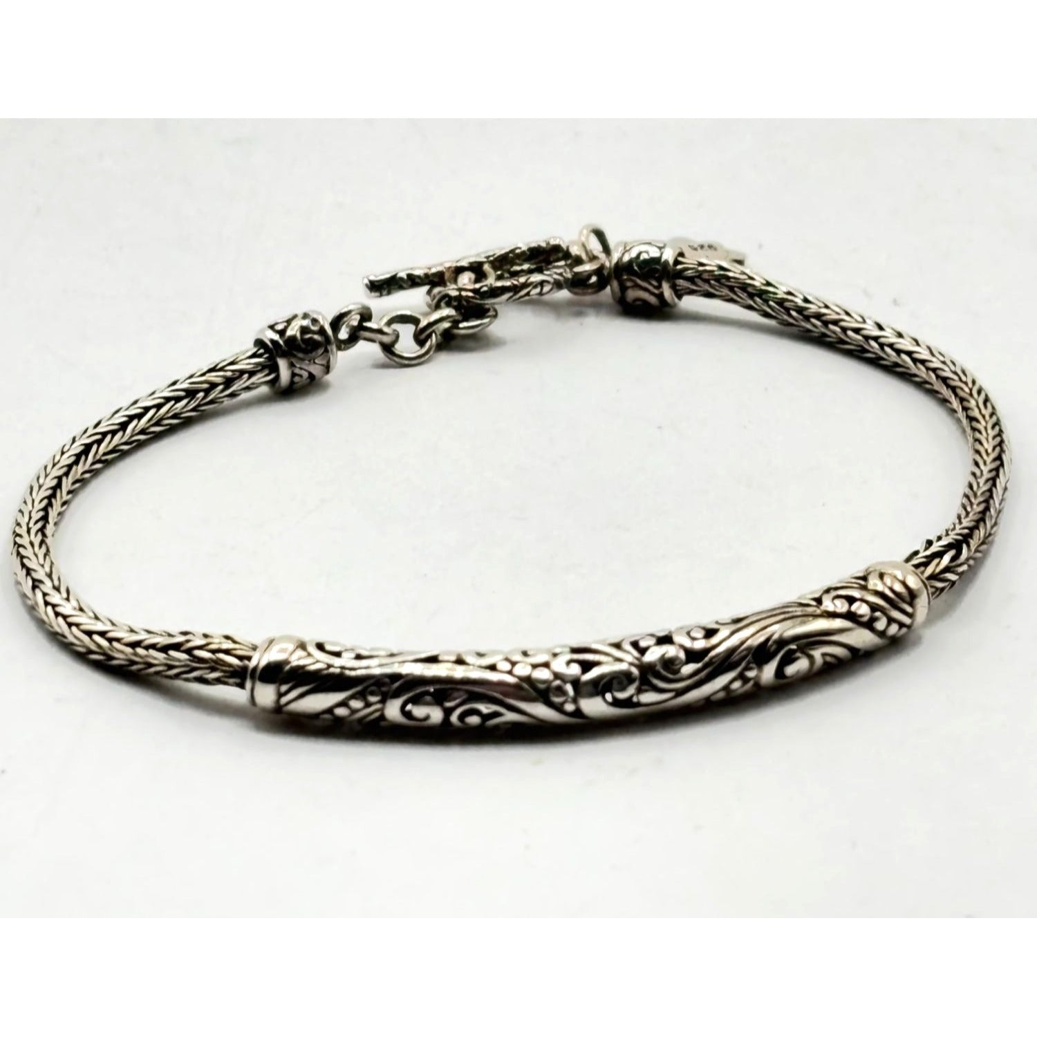 This intricately designed sterling silver bracelet embodies elegance and sophistication, featuring detailed Balinese-style engravings. Its durable toggle clasp ensures a secure fit. Crafted from high-quality 925 silver, this bracelet is both a stylish and timeless accessory for any wardrobe.